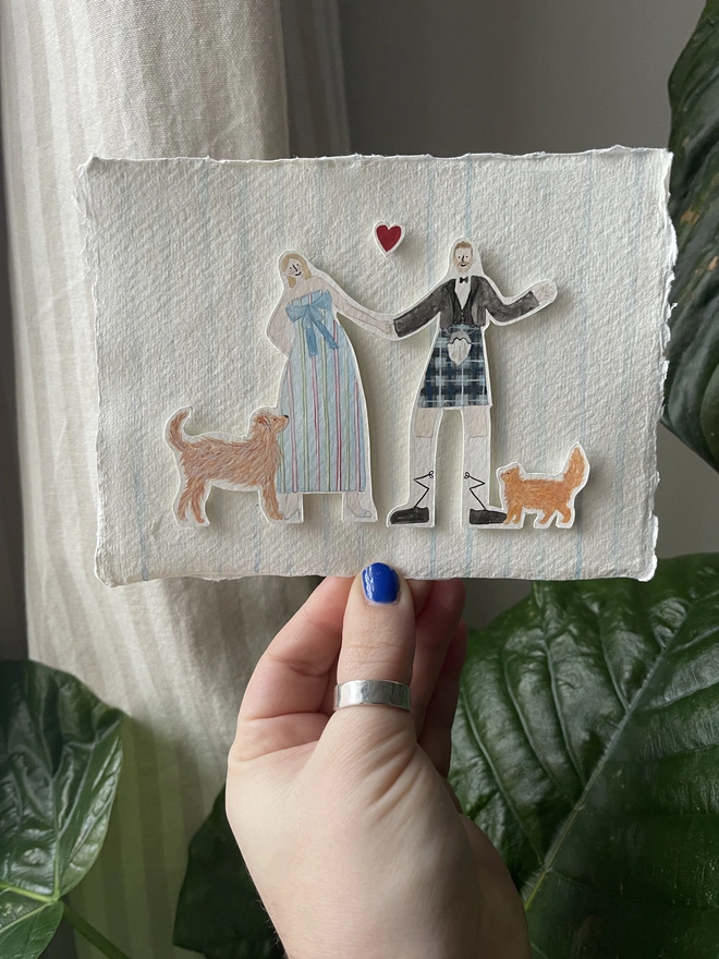 Custom Couple & 2 x Pet Portrait - Handmade A6 Illustration
