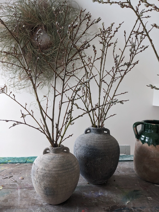 Rustic Ribbed Vase Jar with Dried Pussy Willow Branches
