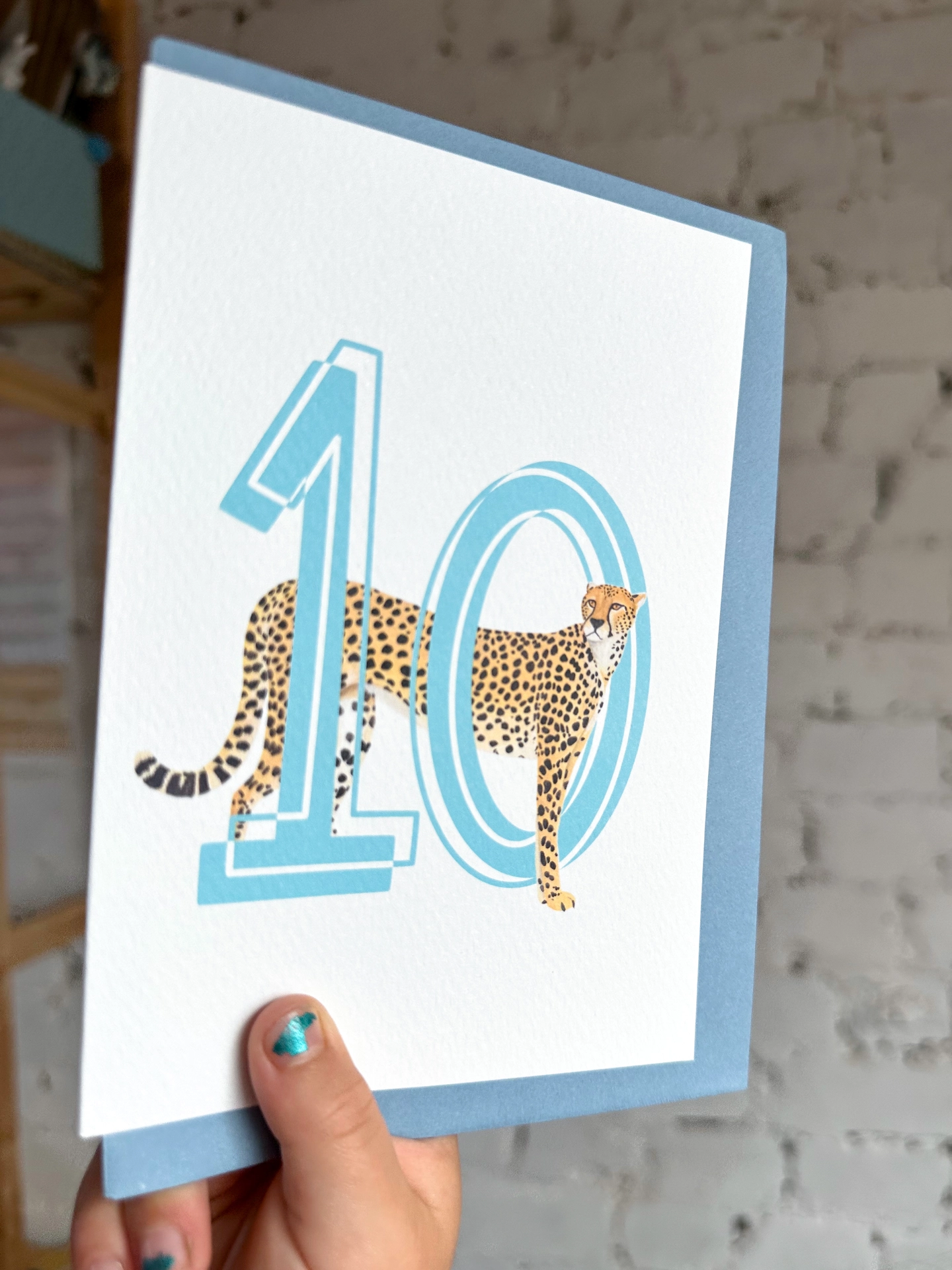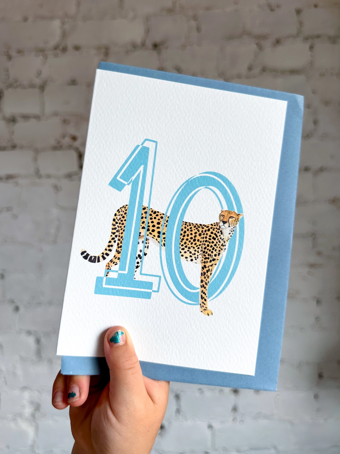 A cool, chic take on a number birthday card! Bright, bold and featuring a lovely illustration of a Cheetah. Perfect for a tenth birthday!
