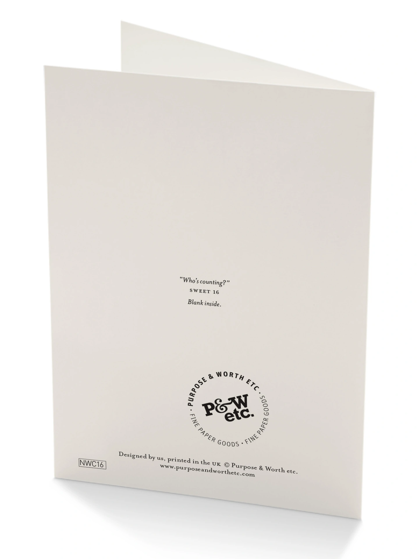 You only turn sweet 16 once…but who's counting? This fun 16th birthday card from our 'Who's counting?' range of birthday cards is a fresh take on all those milestone birthdays in life. Cleverly illustrating the passing years, they are a witty option for everyone on your birthday list.