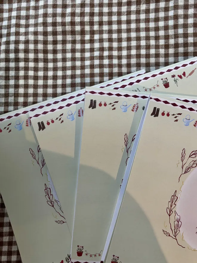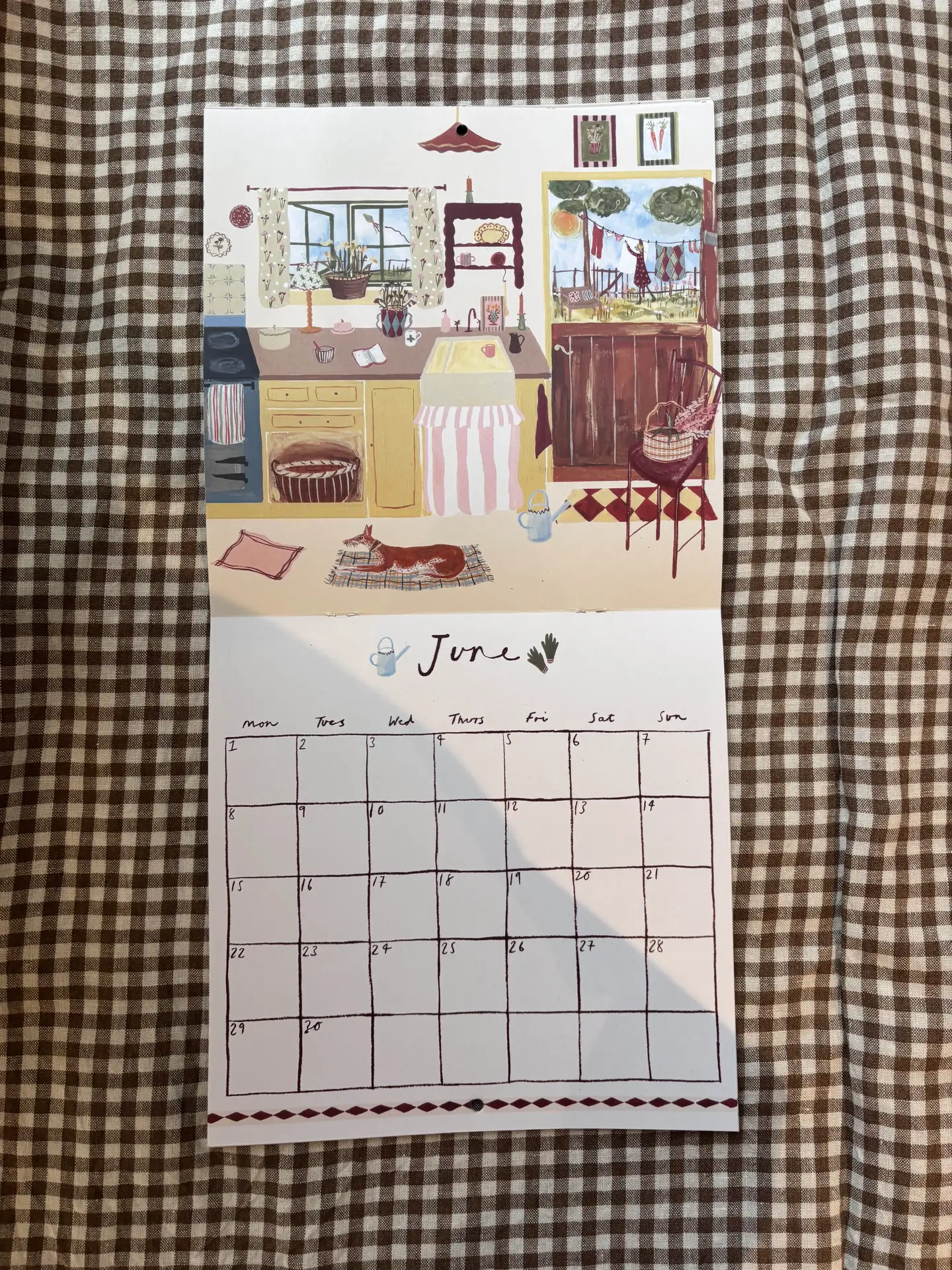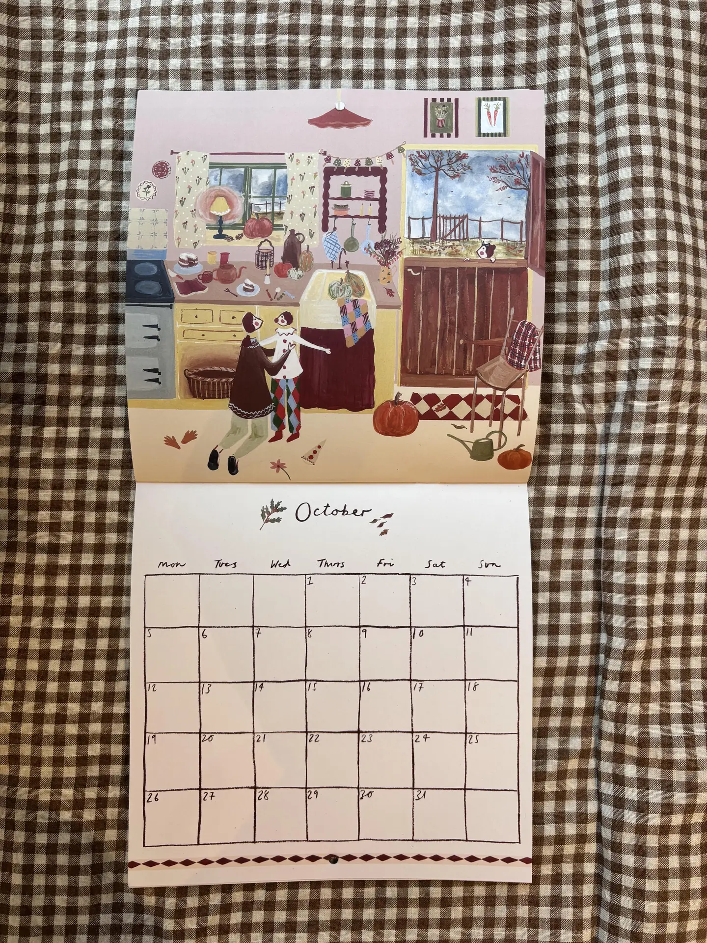 It includes 12 original gouache paintings measuring 21cm x 21cm. Each month has been hand painted, illustrating the changing of the seasons inside and outside of the home and if you look closely there's plenty of little stories going on. Each page is from the same perspective but decorated by seasonal changes.
