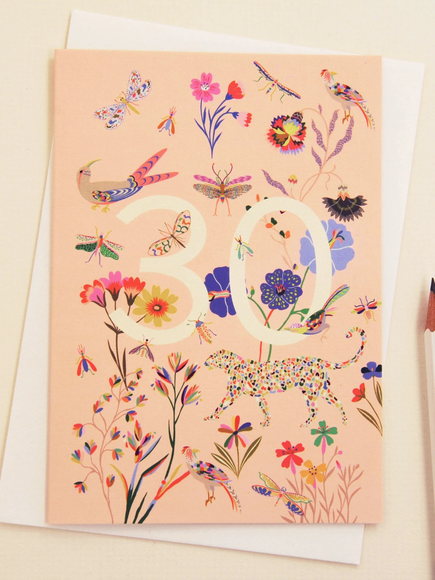 Set against a soft peach background, the vibrant mix of botanical elements and tiny creatures creates a lively, celebratory feel while still keeping the design elegant and modern. The detailed illustration makes this a special milestone card that stands out and feels thoughtful to give.