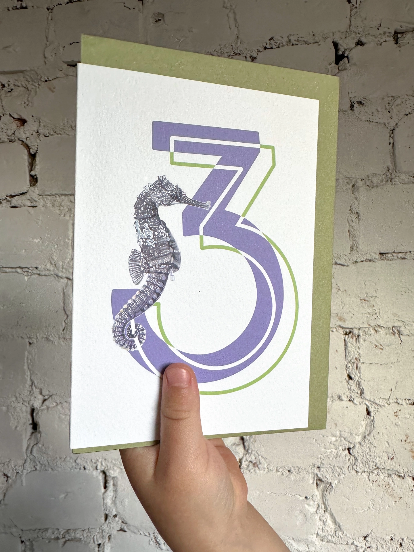 A cool, chic take on a number birthday card! Bright, bold and featuring a lovely illustration of a Seahorse. Perfect for a third birthday! Or could also be a cool way to say Happy Anniversary!