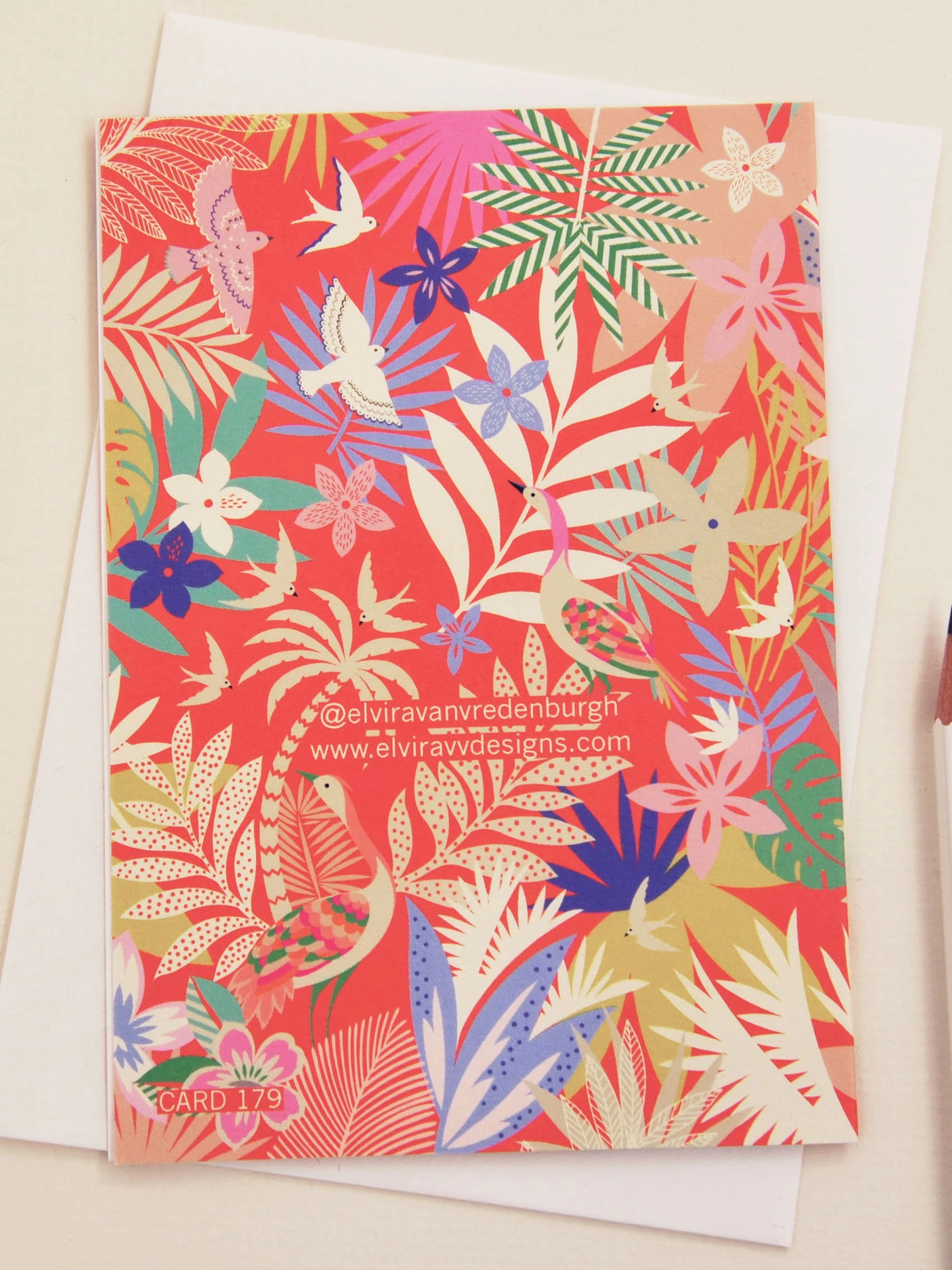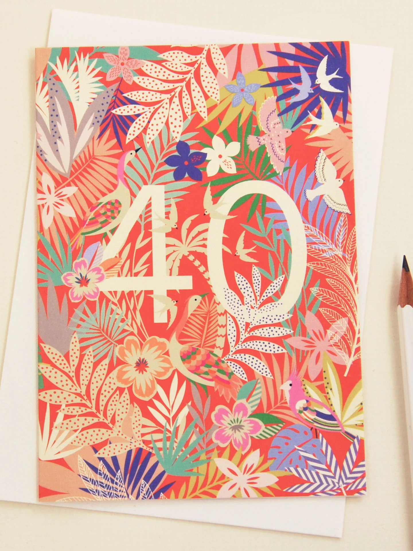 A colourful illustrated 40th birthday card featuring a large number set within a vibrant tropical inspired floral design...