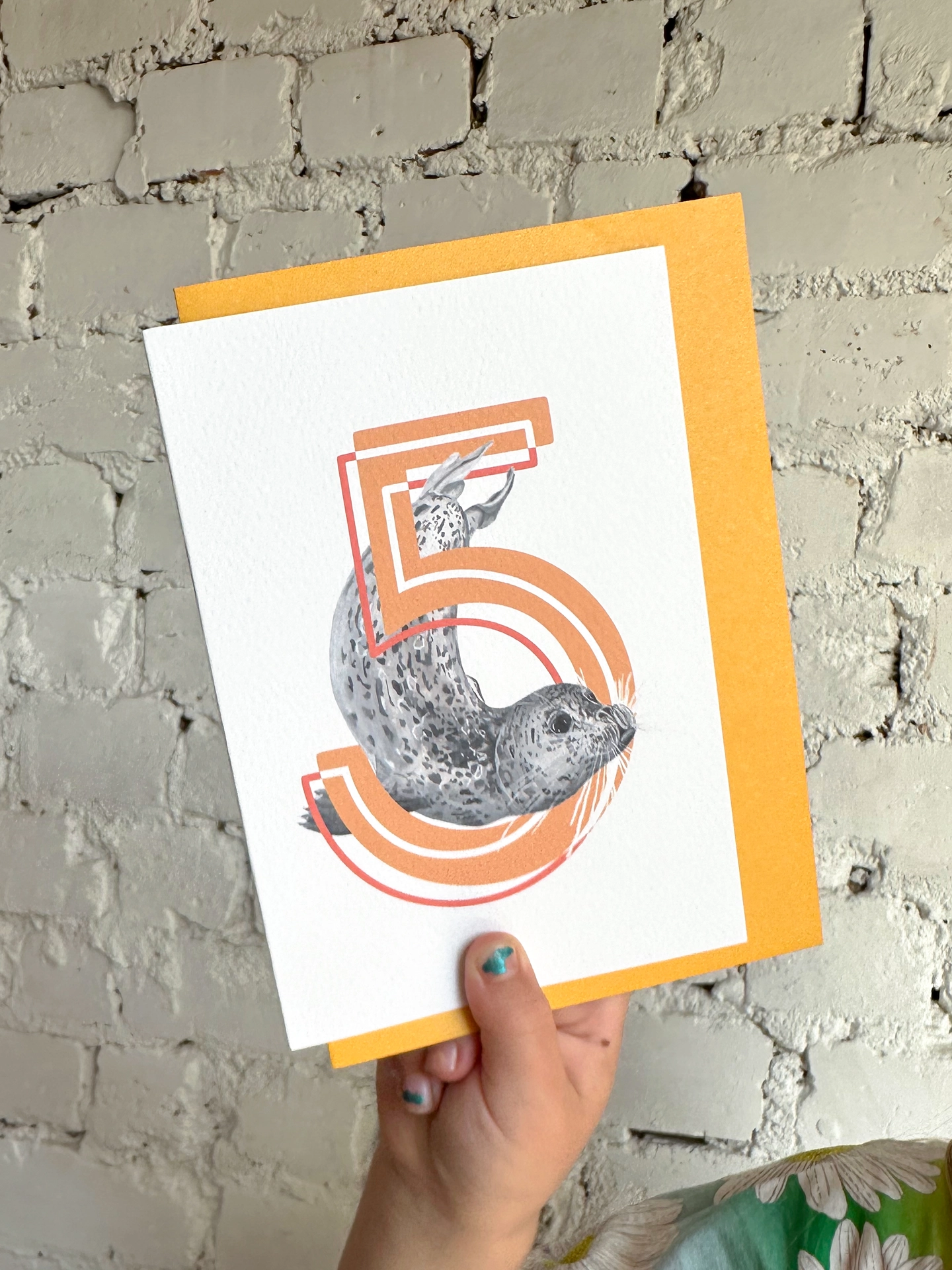 A cool, chic take on a number birthday card! Bright, bold and featuring a lovely illustration of a Harbour Seal. Perfect for a fifth birthday! Or could also be a cool way to say Happy Anniversary!