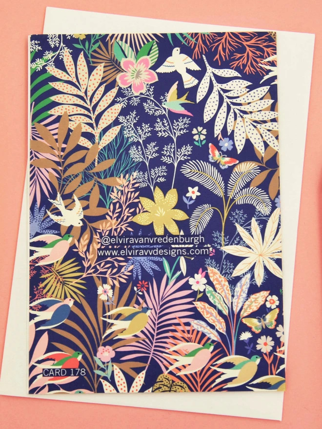 A vibrant illustrated 60th birthday card featuring a large number set amongst colourful flowers, birds and leafy botanical details...