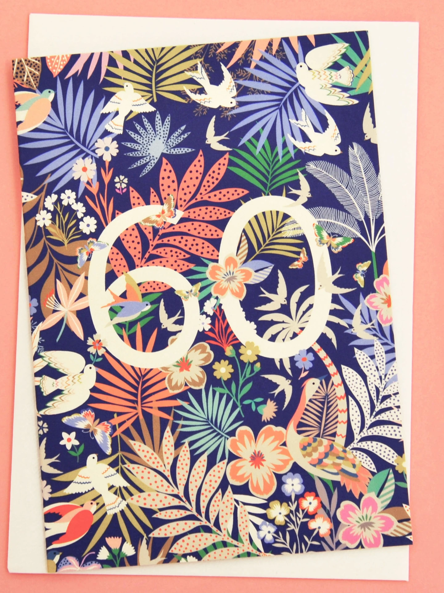A vibrant illustrated 60th birthday card featuring a large number set amongst colourful flowers, birds and leafy botanical details.