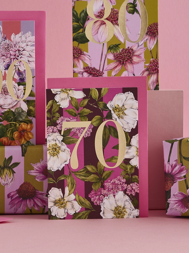 An intricately drawn luxury greeting card on a fun striped base - perfect for celebrating that milestone birthday!