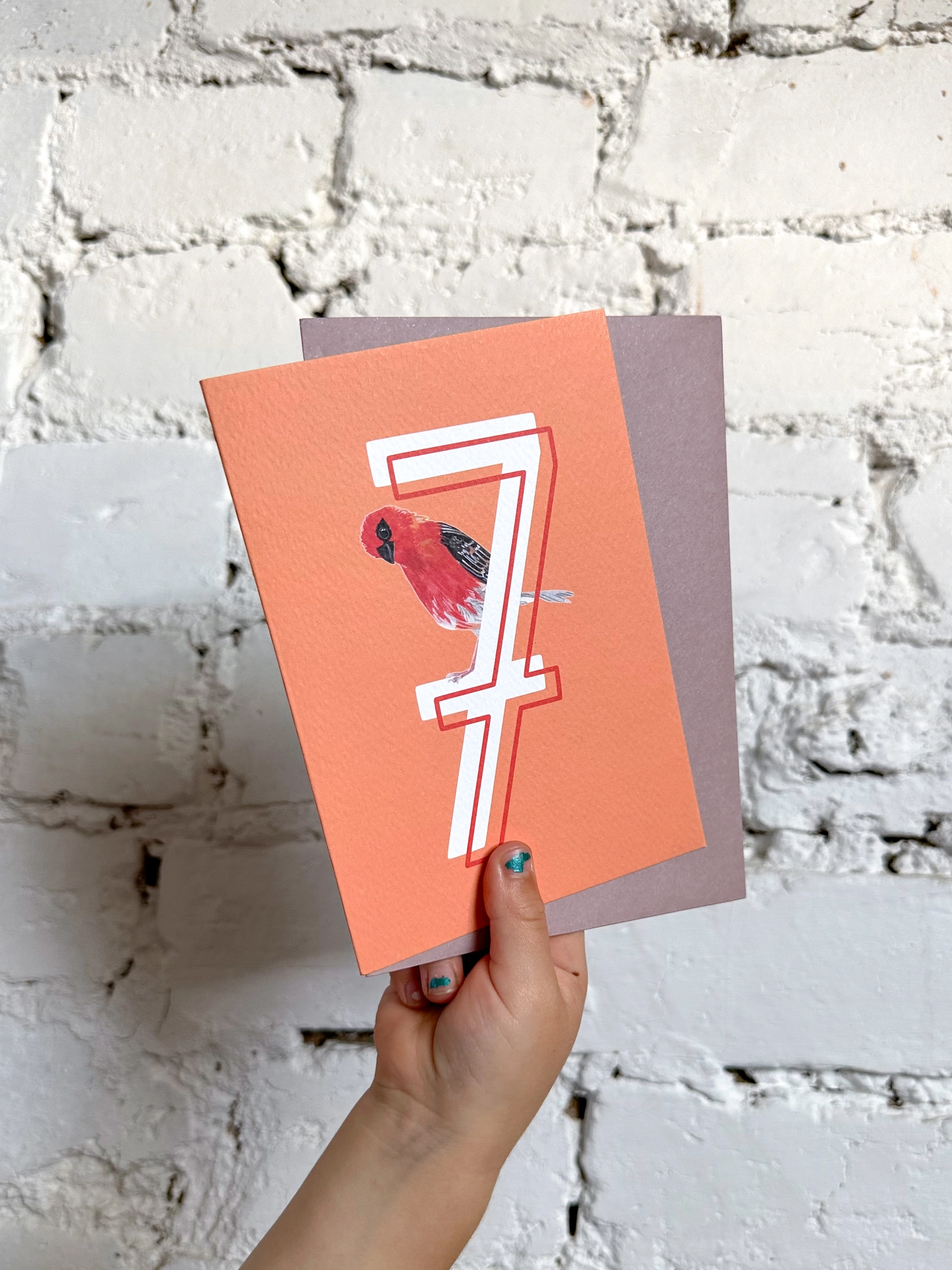 A cool, chic take on a number birthday card! Bright, bold and featuring a lovely illustration of a Madagascan Fody Bird. Perfect for a seventh birthday! Or could also be a cool way to say Happy Anniversary!