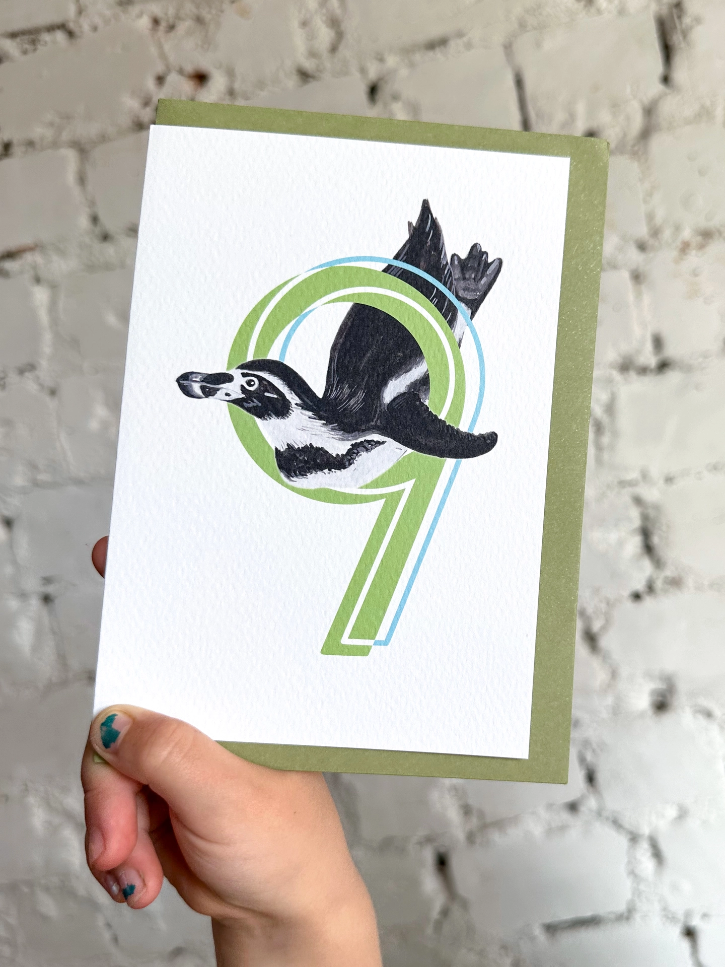 A cool, chic take on a number birthday card! Bright, bold and featuring a lovely illustration of a Penguin. Perfect for a ninth birthday! Or could also be a cool way to say Happy Anniversary!