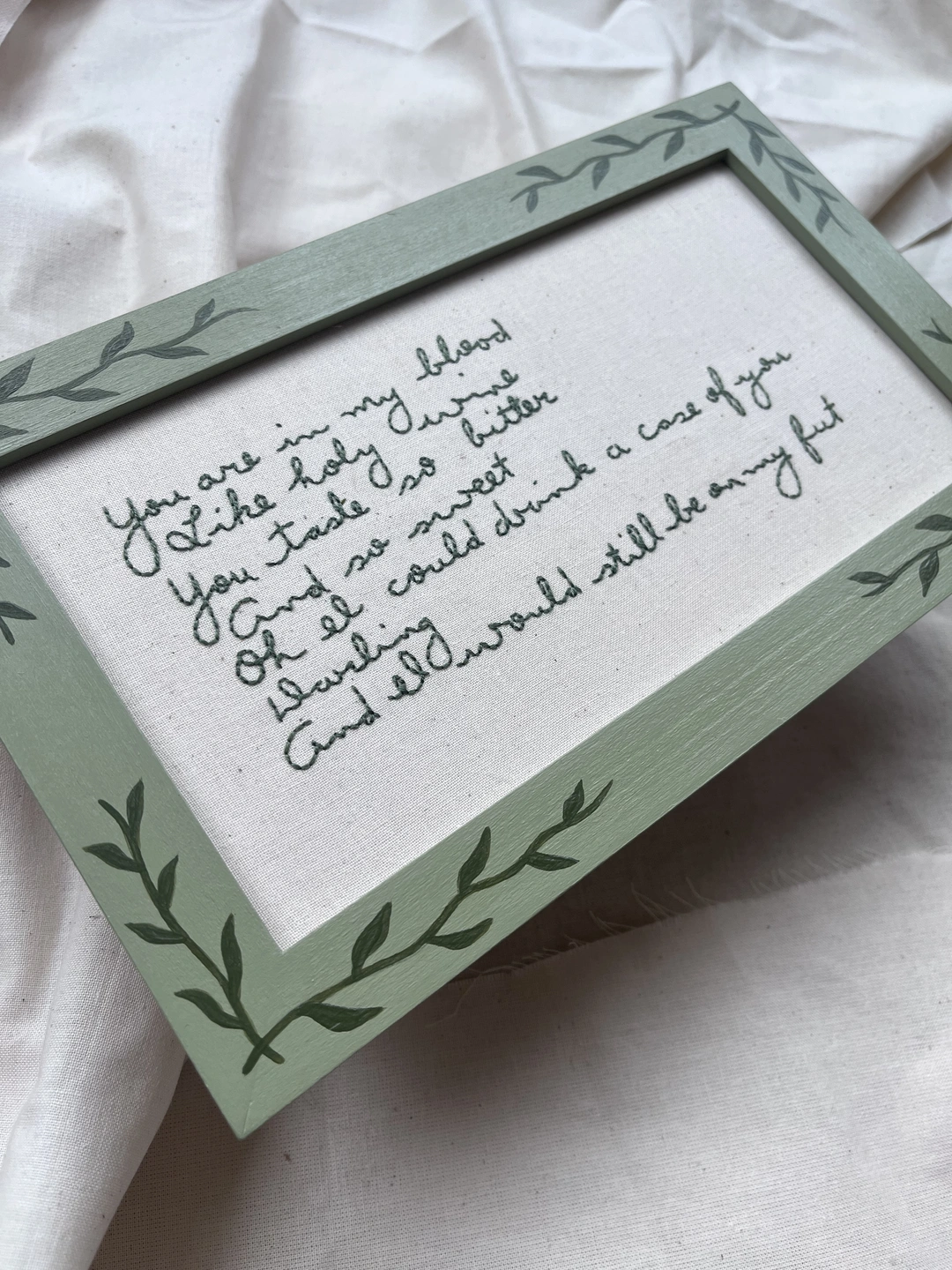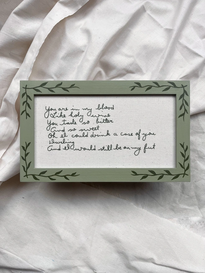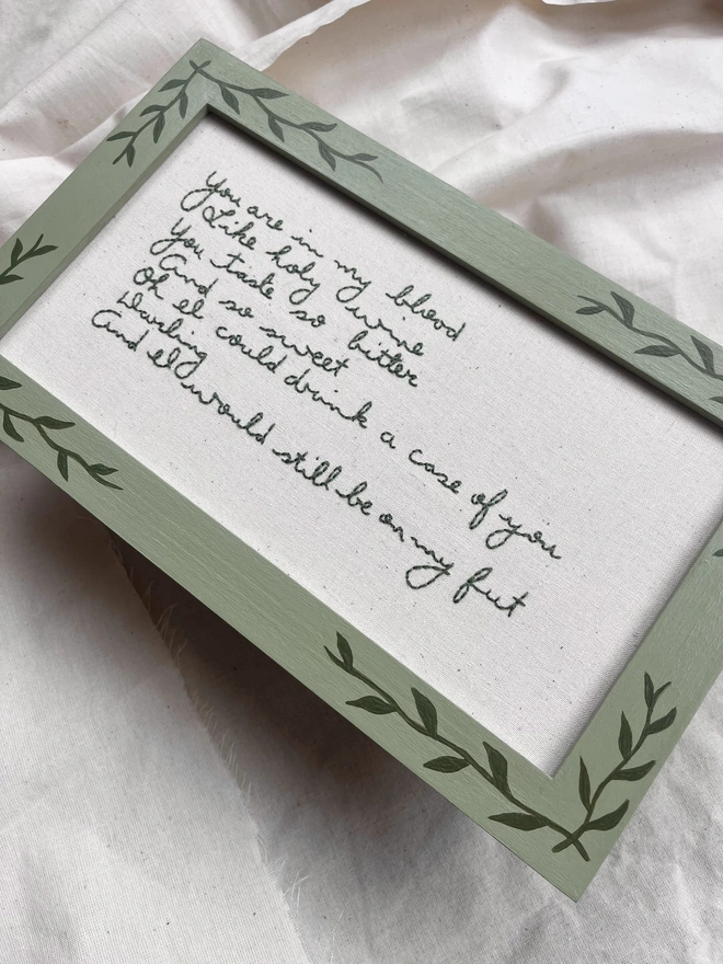 Hand Embroidered artwork, presented in a bespoke hand painted frame with romantic vine pattern.