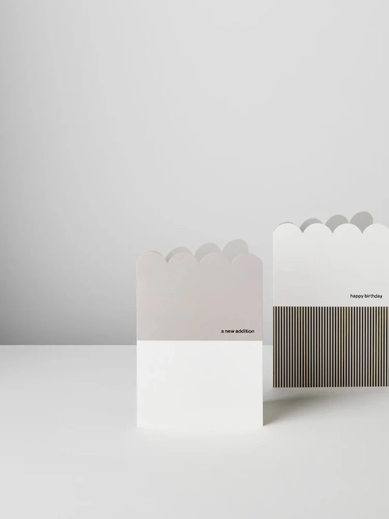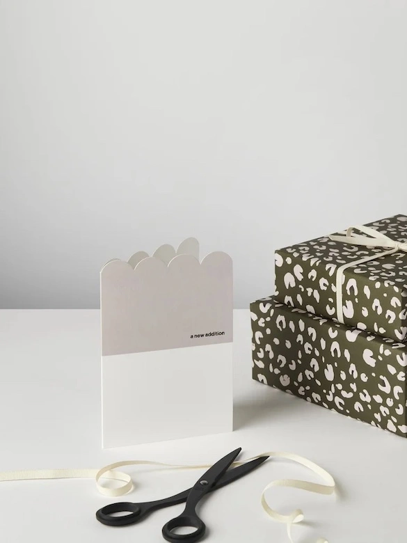 Our newest range, featuring a beautiful top edge scallop. Our new baby card comes in a french grey and has the words ‘a new addition’ foiled in black on the front. Blank inside for your own special message.