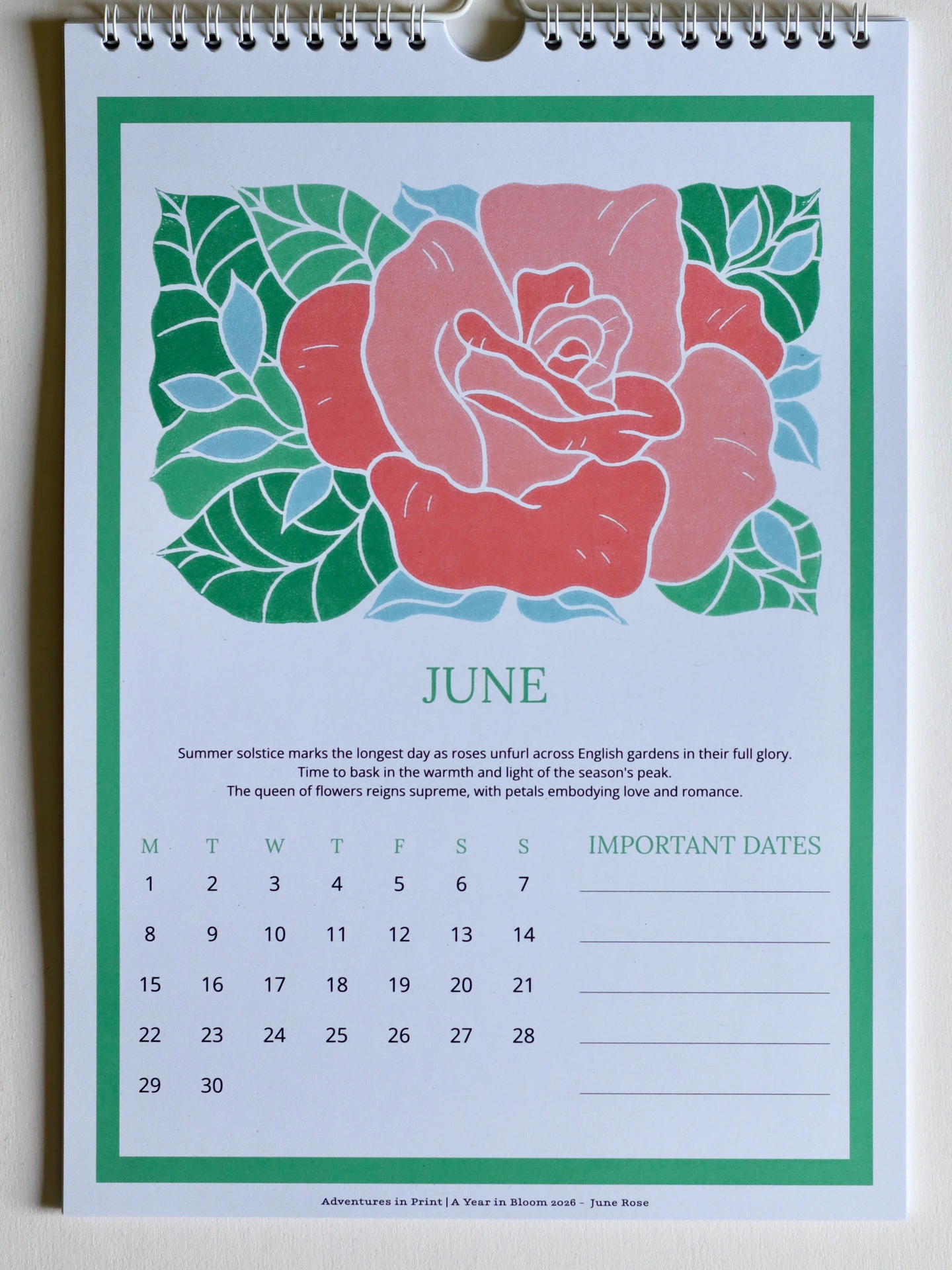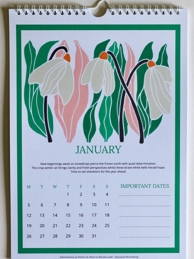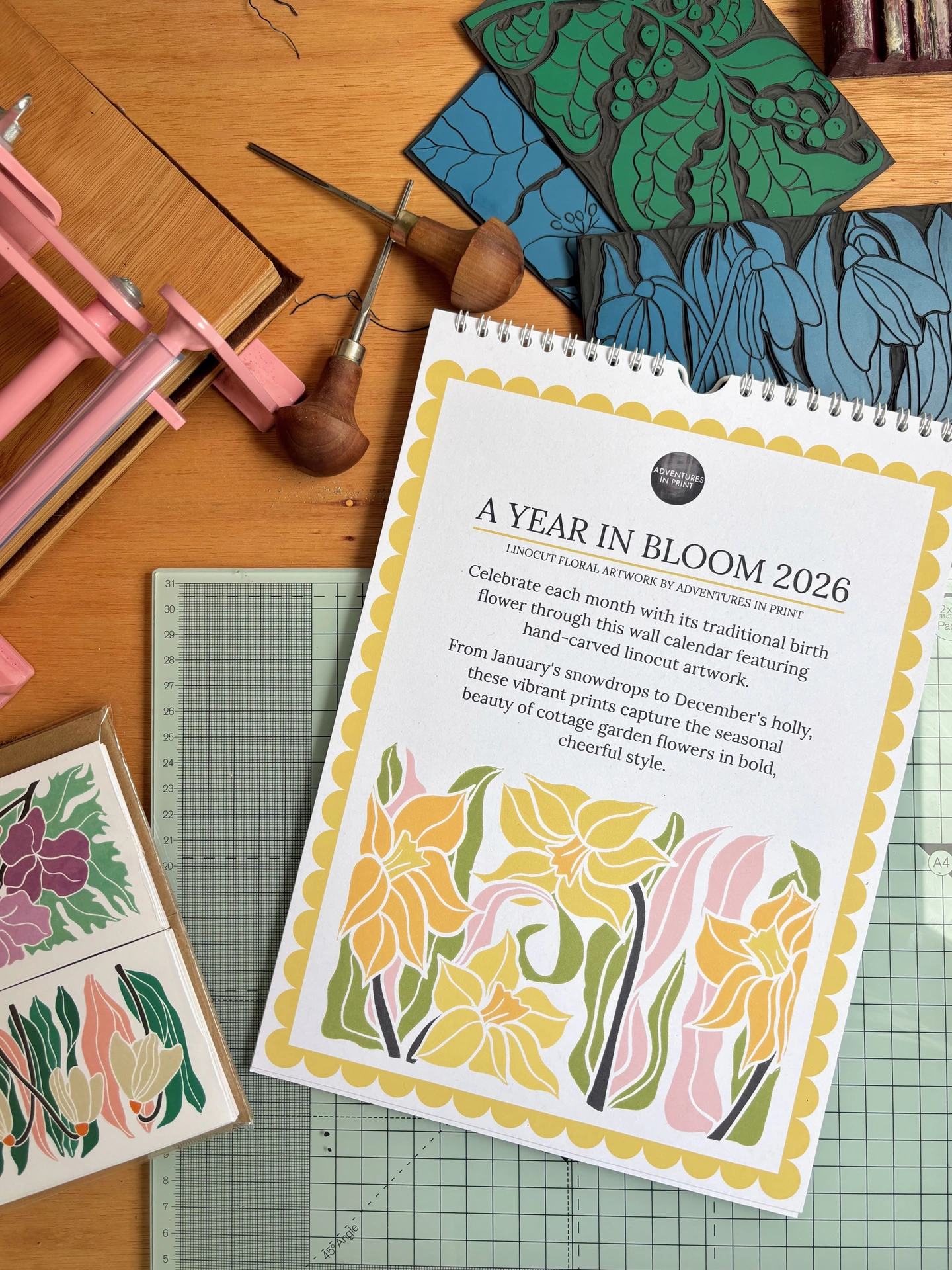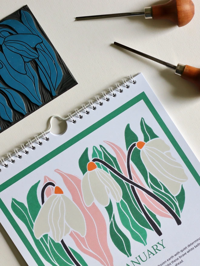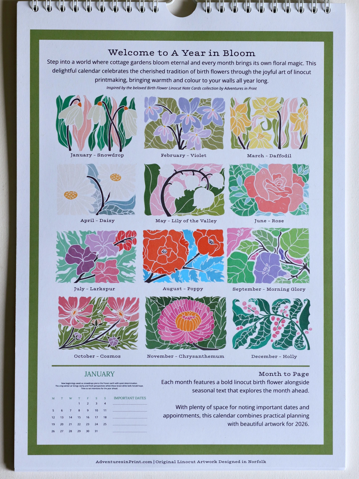 Transform your planning into a celebration of nature's beauty - order your Year in Bloom 2026 today.Transform your wall into a gallery of seasonal beauty with 12 stunning linocut prints, each celebrating a traditional birth flower. From January's hopeful snowdrops to December's festive holly, these vibrant designs capture the essence of cottage garden charm in bold, graphic style.