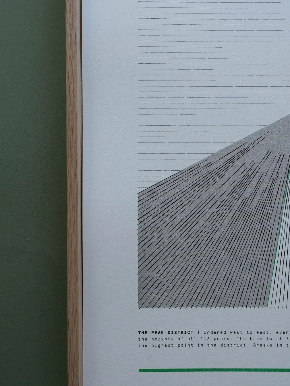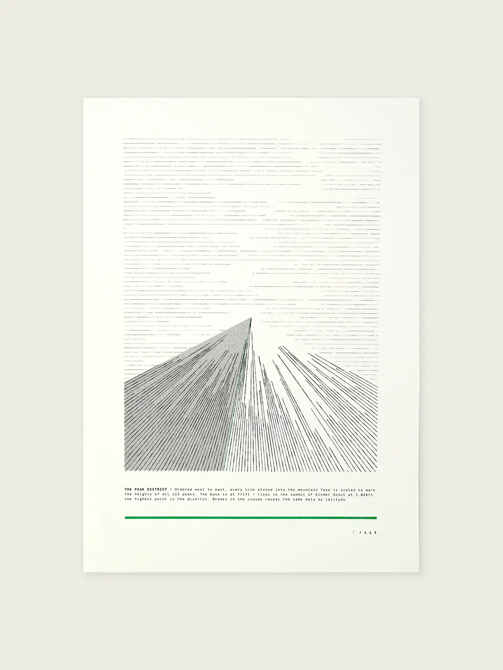 Using data from every summit within the Peak District, each line represents the height of an individual mountain. Ordered west to east (left to right), the longer the line, the taller the mountain.