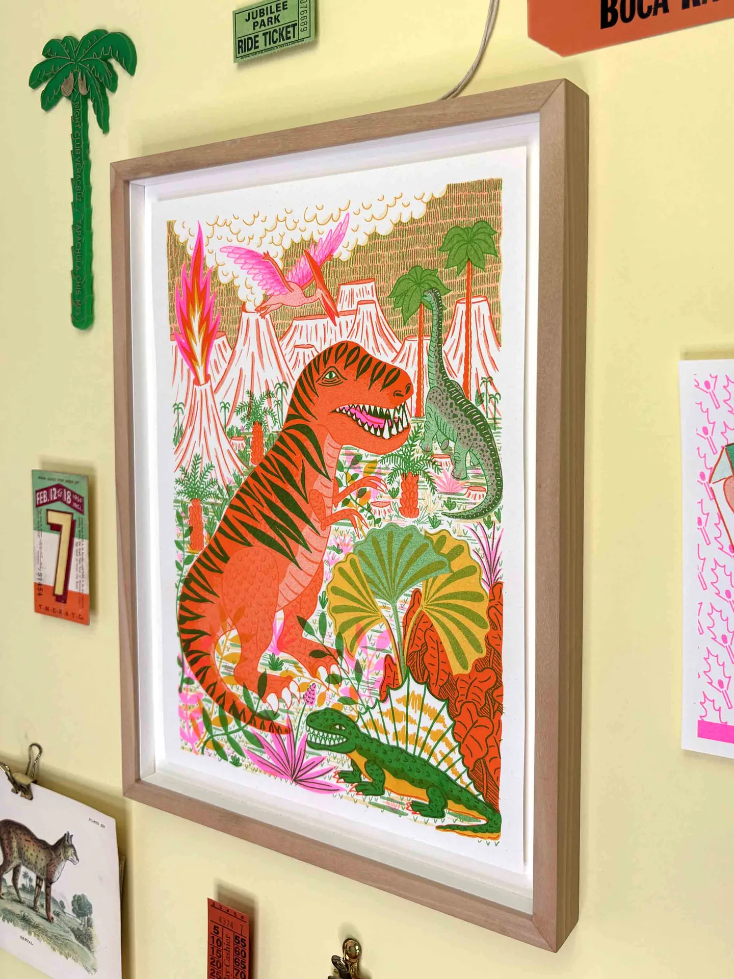 Add a roar of adventure to your walls with this Wild Dinosaur A4 Risograph Print. Featuring a Tyranosaurus Rex exploring a lush prehistoric landscape, this lively artwork brings colour, character, and Jurassic joy to any child’s room...