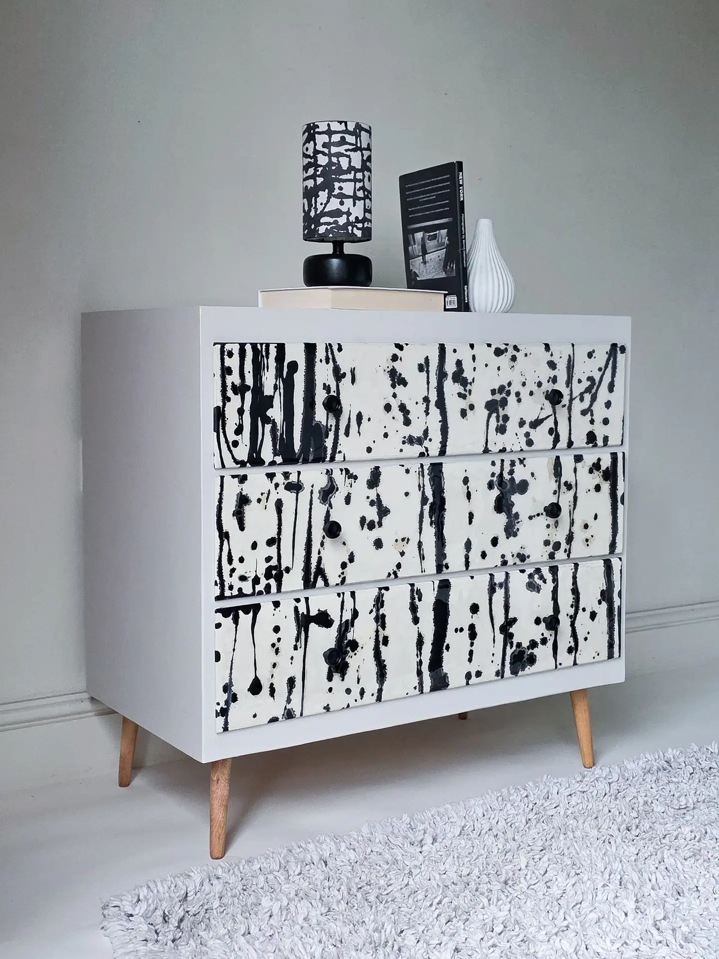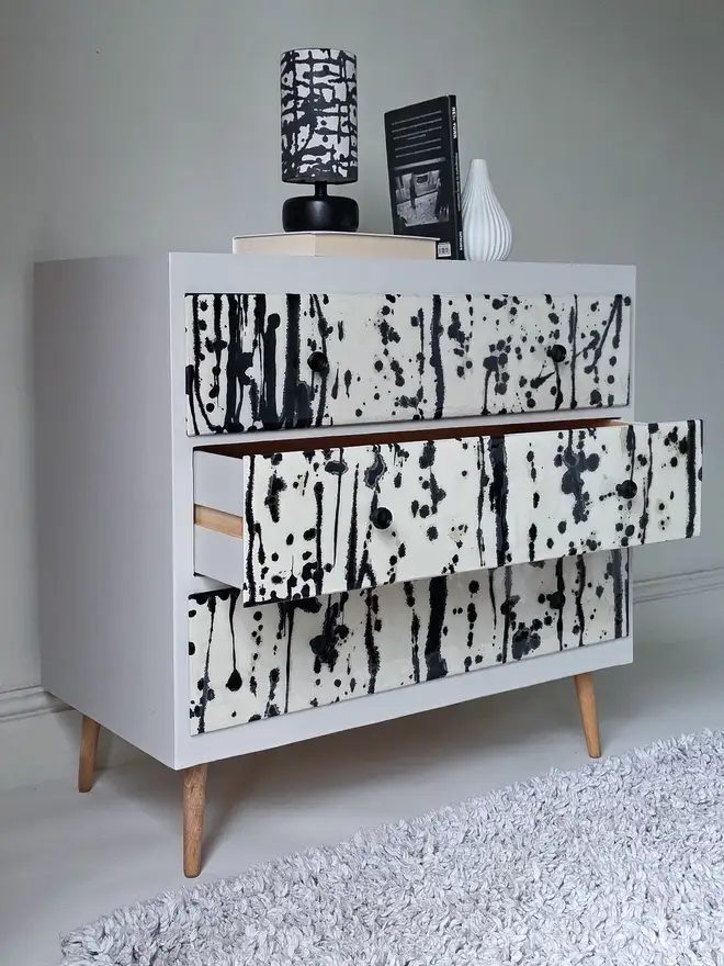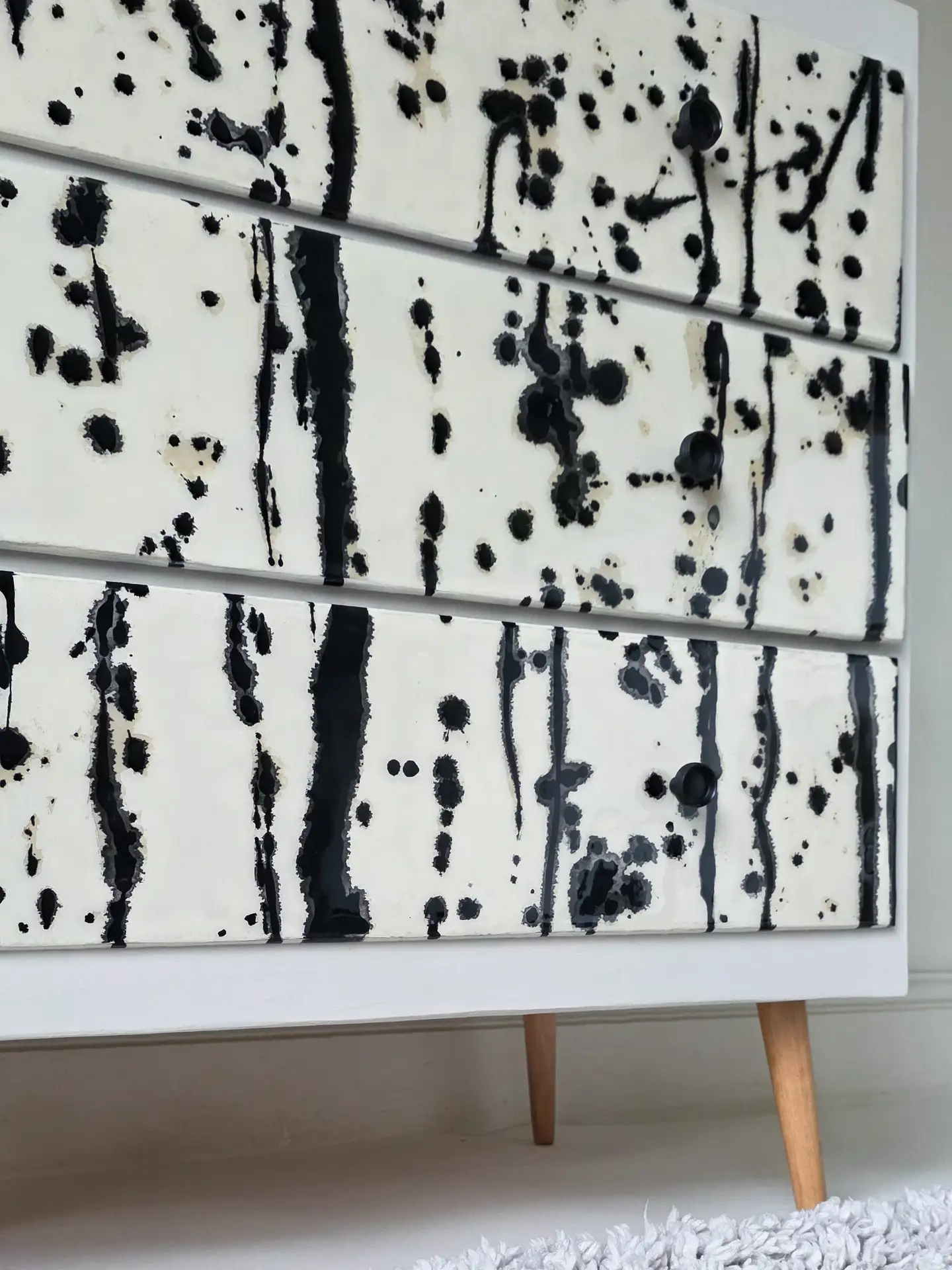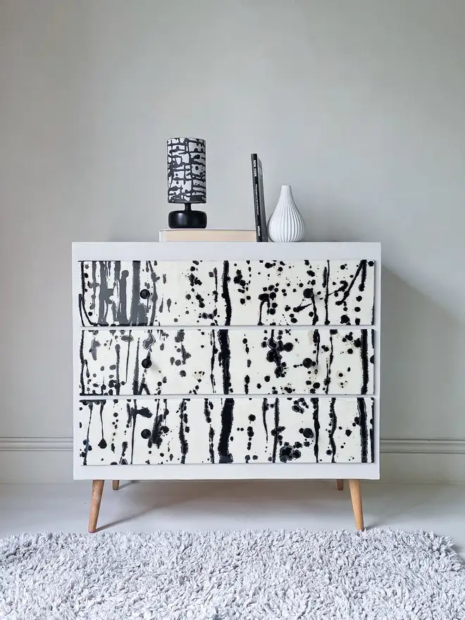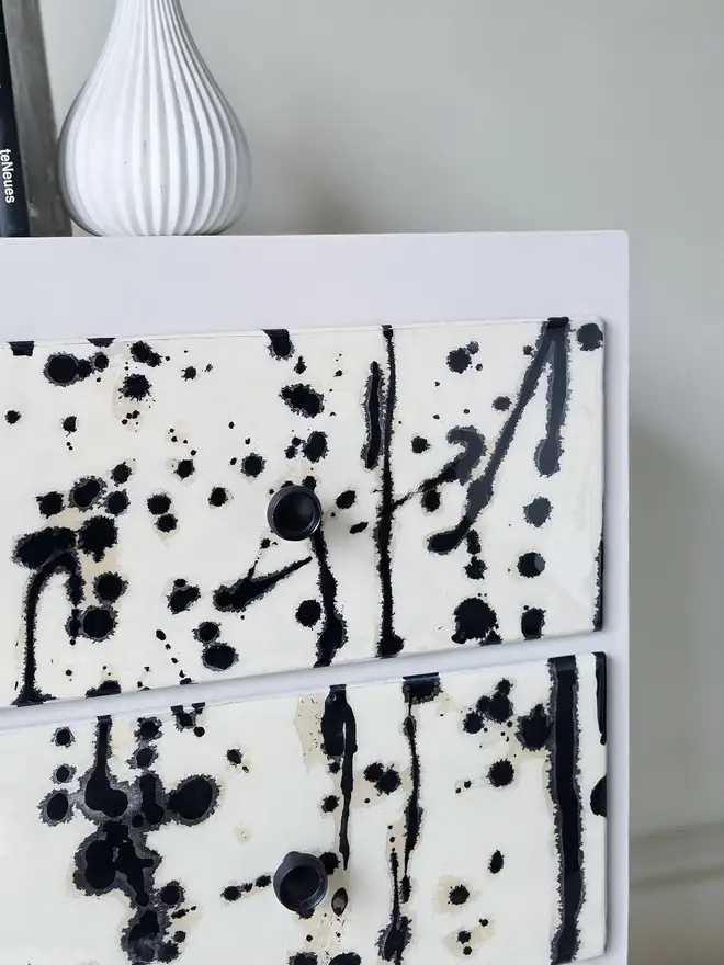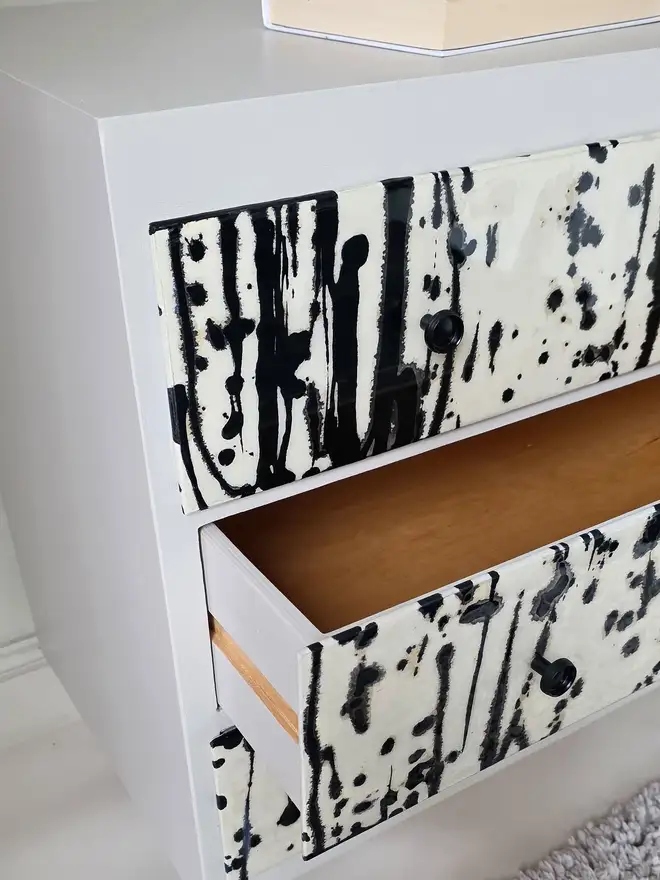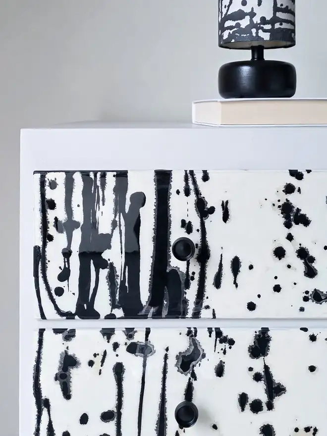 The design on the drawer fronts has been created using handpainted paper which has then been cut up and collaged to create bespoke artwork. I used a monochrome palette for a striking ink blotted effect and this has then been sealed with glossy resin to create a shiny glass like appearance you will want to touch this piece all the time, trust me! The finish is also super hard-wearing and durable, and can be wiped clean easily.