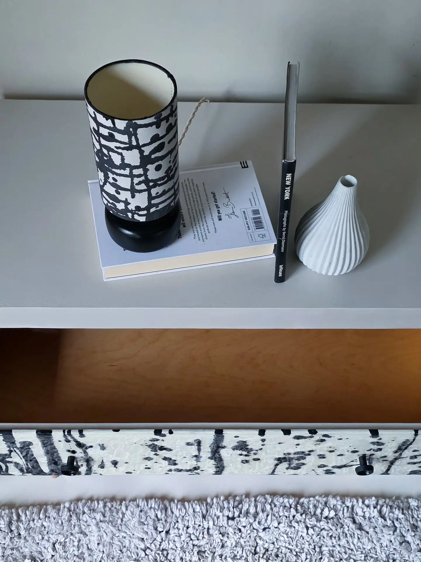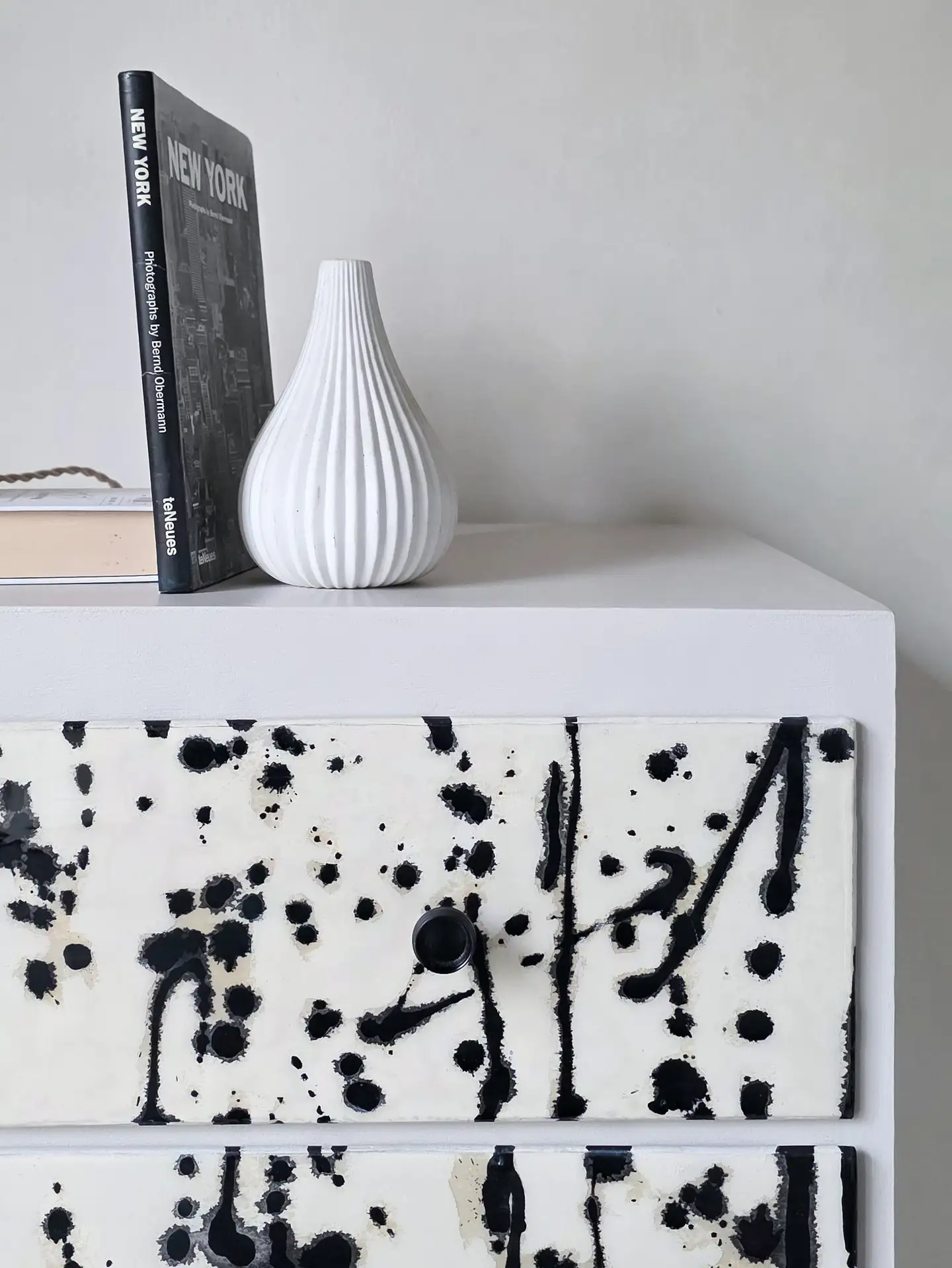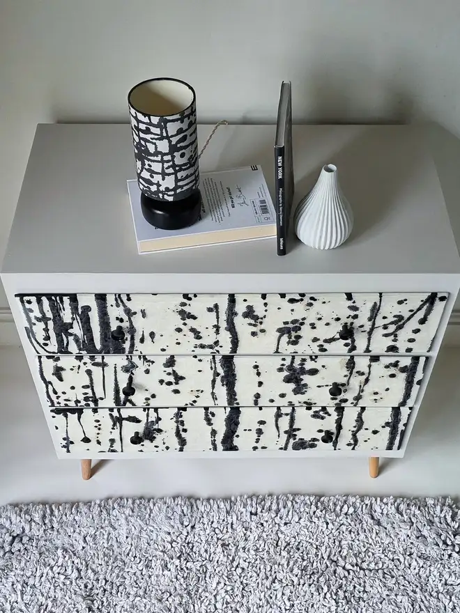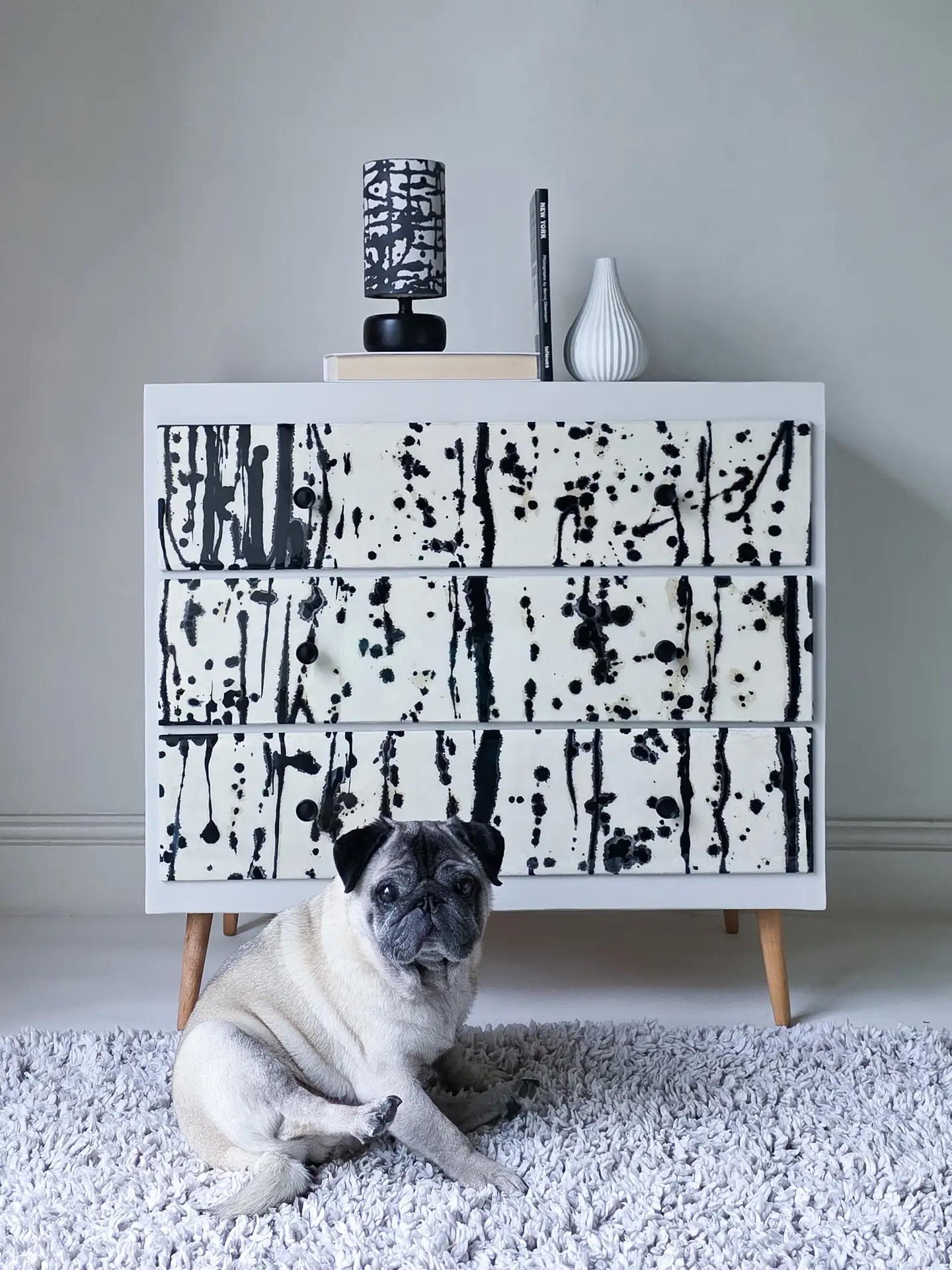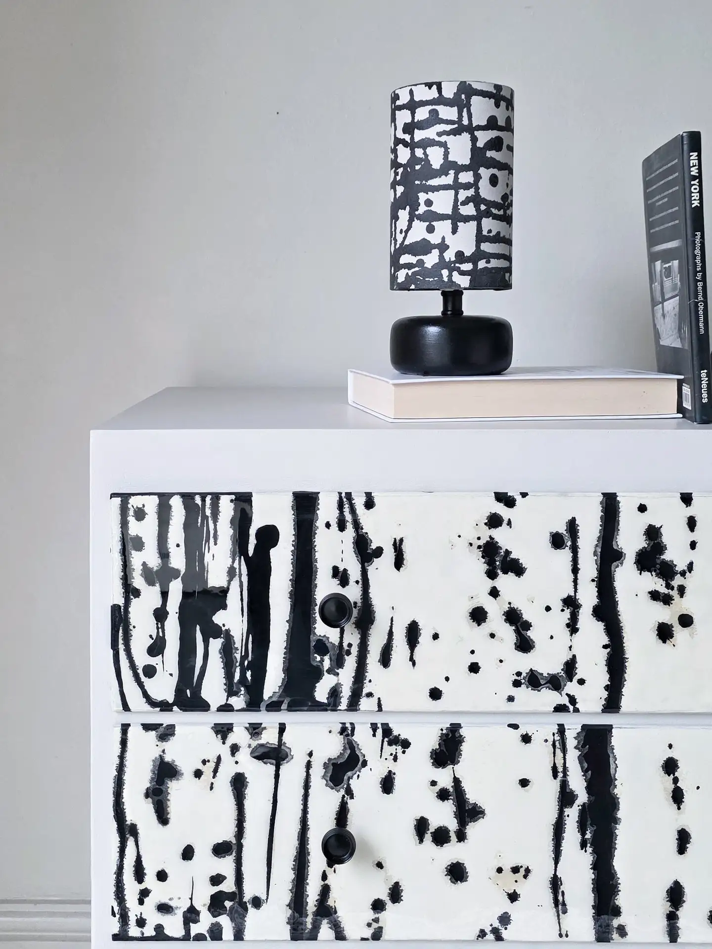 The design on the drawer fronts has been created using handpainted paper which has then been cut up and collaged to create bespoke artwork. I used a monochrome palette for a striking ink blotted effect and this has then been sealed with glossy resin to create a shiny glass like appearance you will want to touch this piece all the time, trust me! The finish is also super hard-wearing and durable, and can be wiped clean easily.