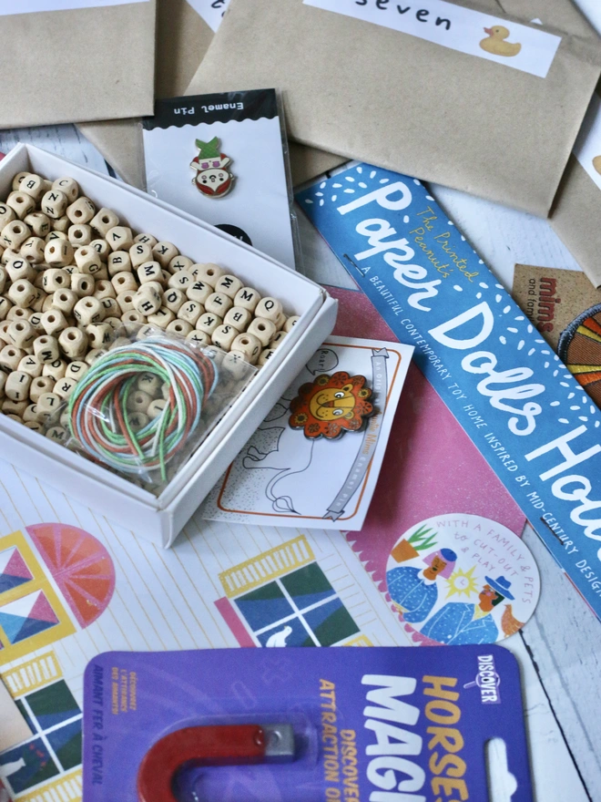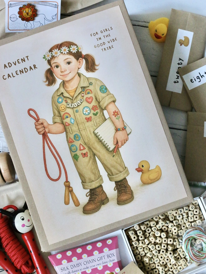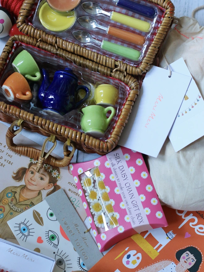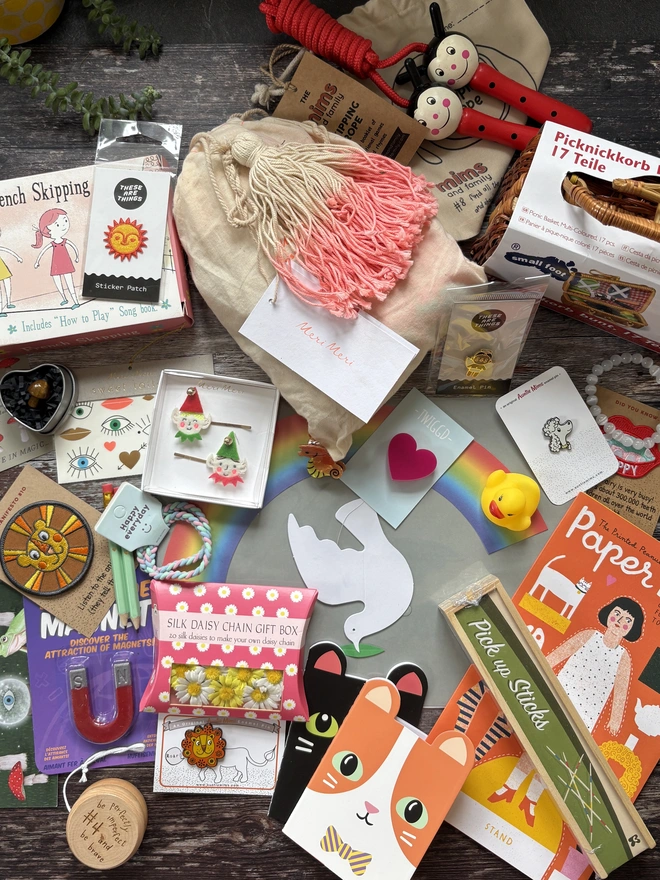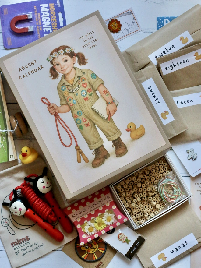 A beautiful advent calendar full of 24 packets of fun. Twenty four individually hand wrapped, high quality gifts that will all bring joy. Expect to find: Meri Meri hair clips, temporary tattoos and tassel garland; retro games and skipping rope; a delightful mini china tea-set in a picnic basket by Small Foot toys, a paper book by The Printed Peanut, plenty of pins and patches by Mims and Family and other brands; silk daisies for a daisy chain; a gemstone and gemstone bracelet; pencils and notepads; wooden dice letter beads; a unique numbered membership certificate - just for fun; and plenty more surprises all in a magnetic snap-shut box.