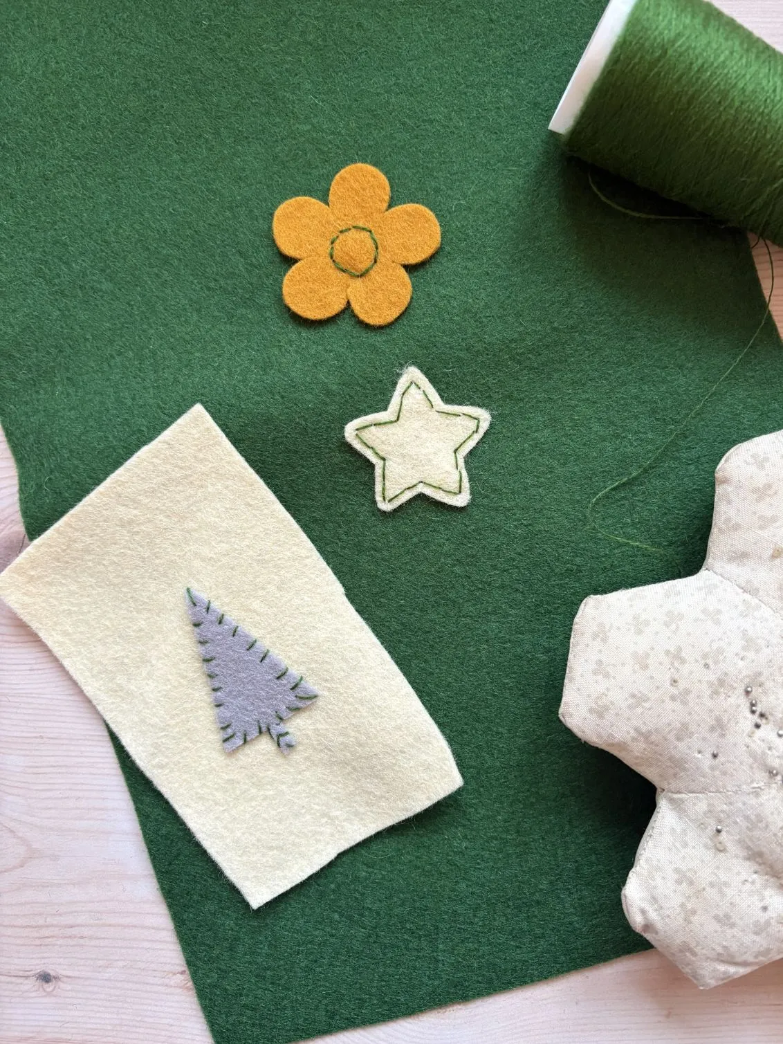 • 25 pre-cut felt shapes with iron-on backing • 5 stitched pieces.