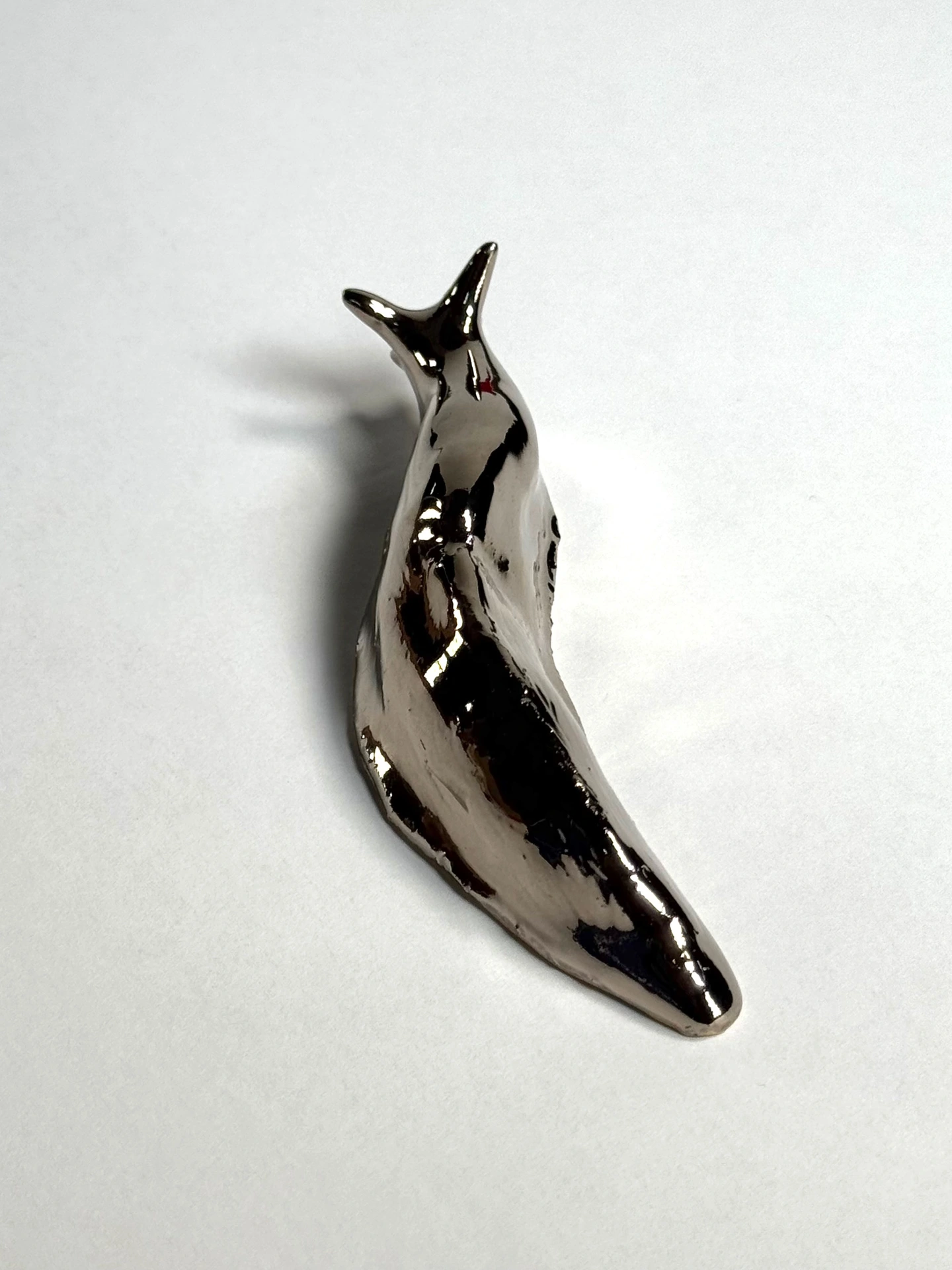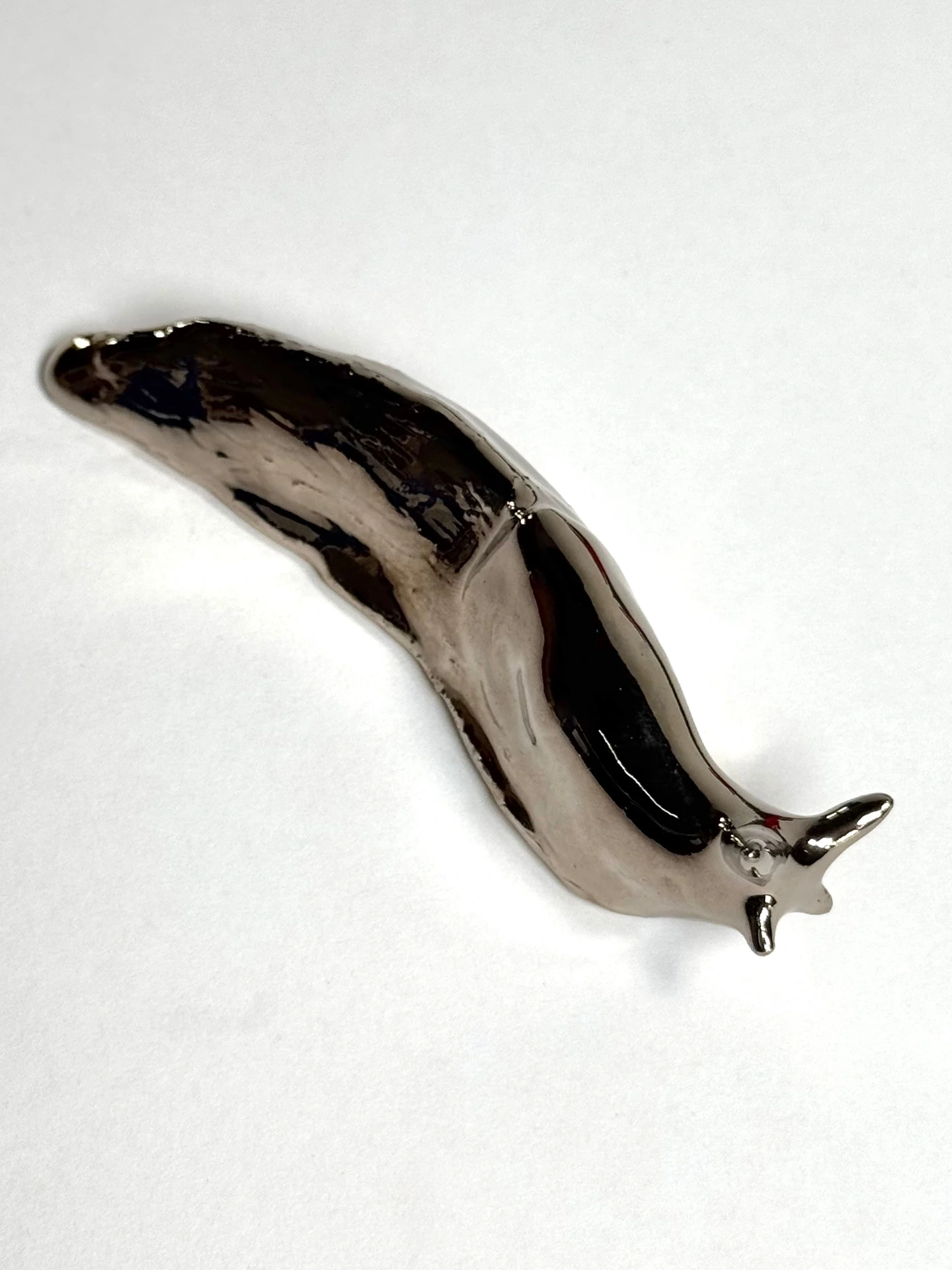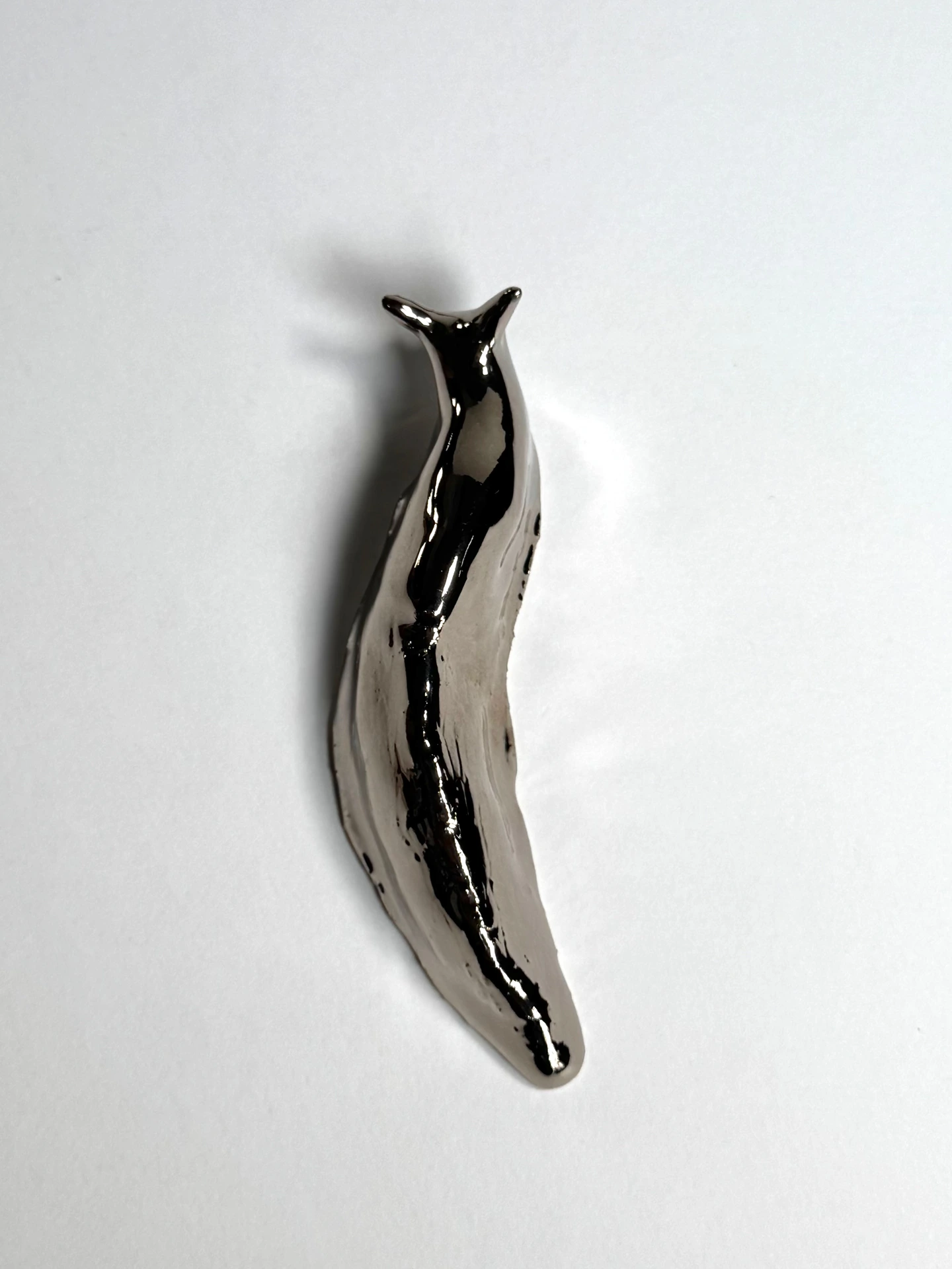 Small stoneware ceramic slug sculpture by Tally Walker Warne. Each small slug is gift packaged in a black, snap shut, magnetic gift box with a ribbon tab.