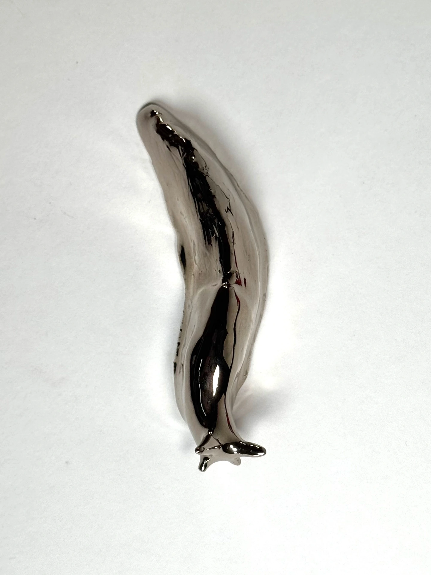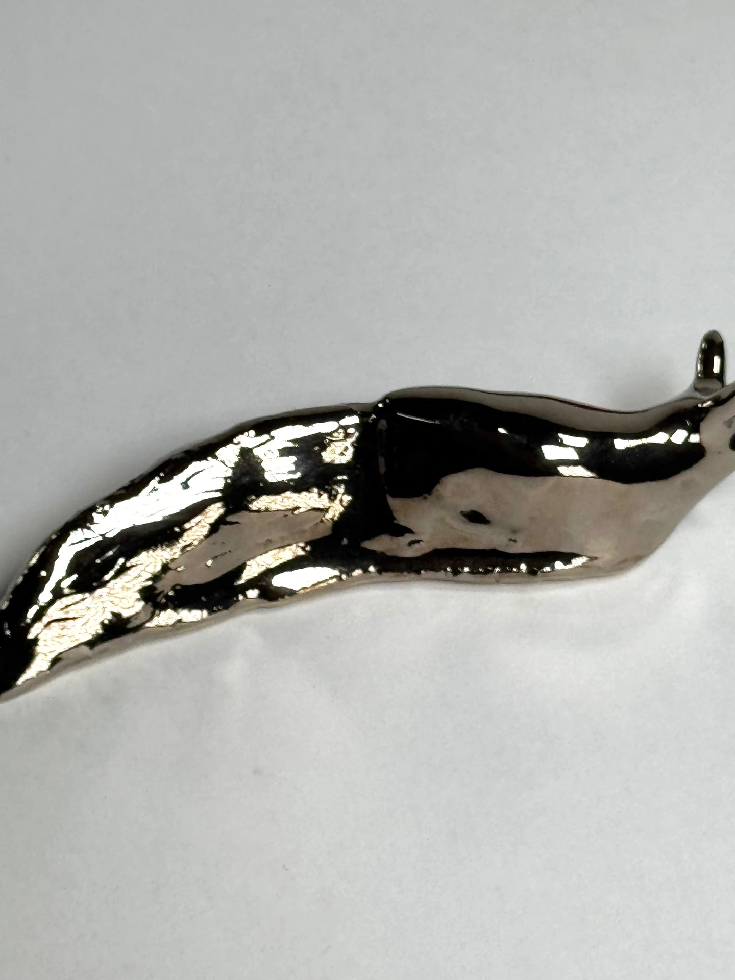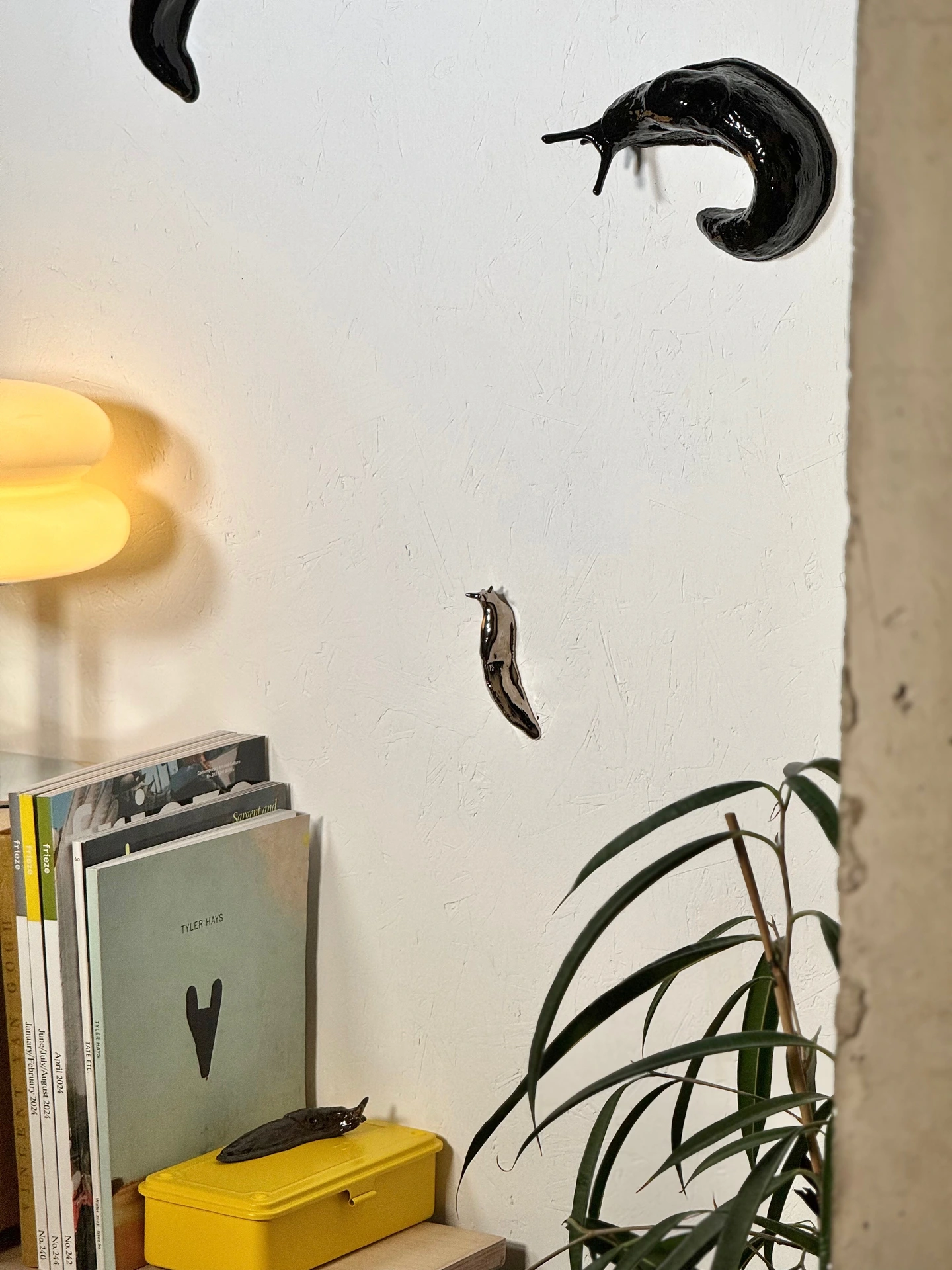 Small stoneware ceramic slug sculpture by Tally Walker Warne. Each small slug is gift packaged in a black, snap shut, magnetic gift box with a ribbon tab.