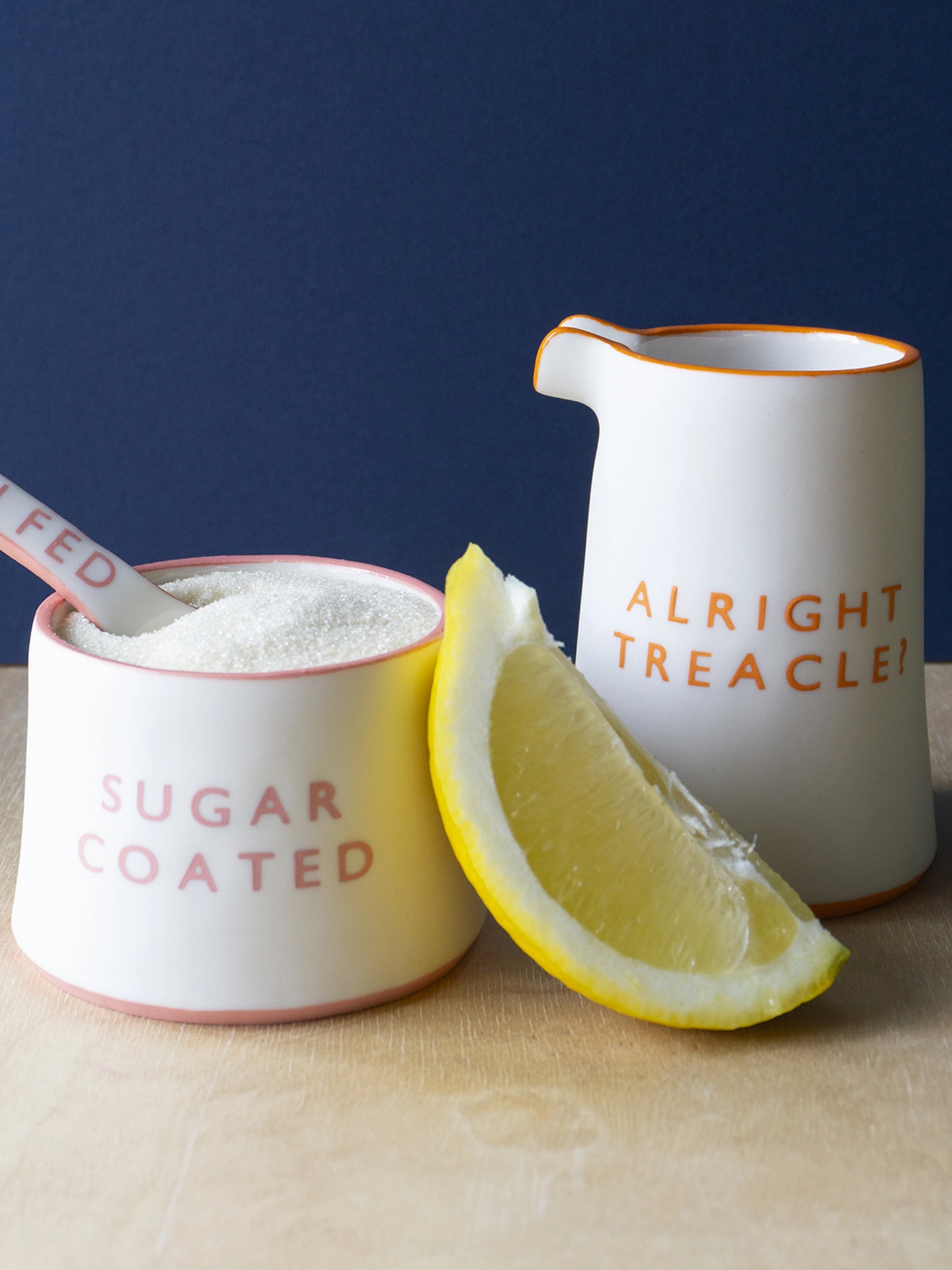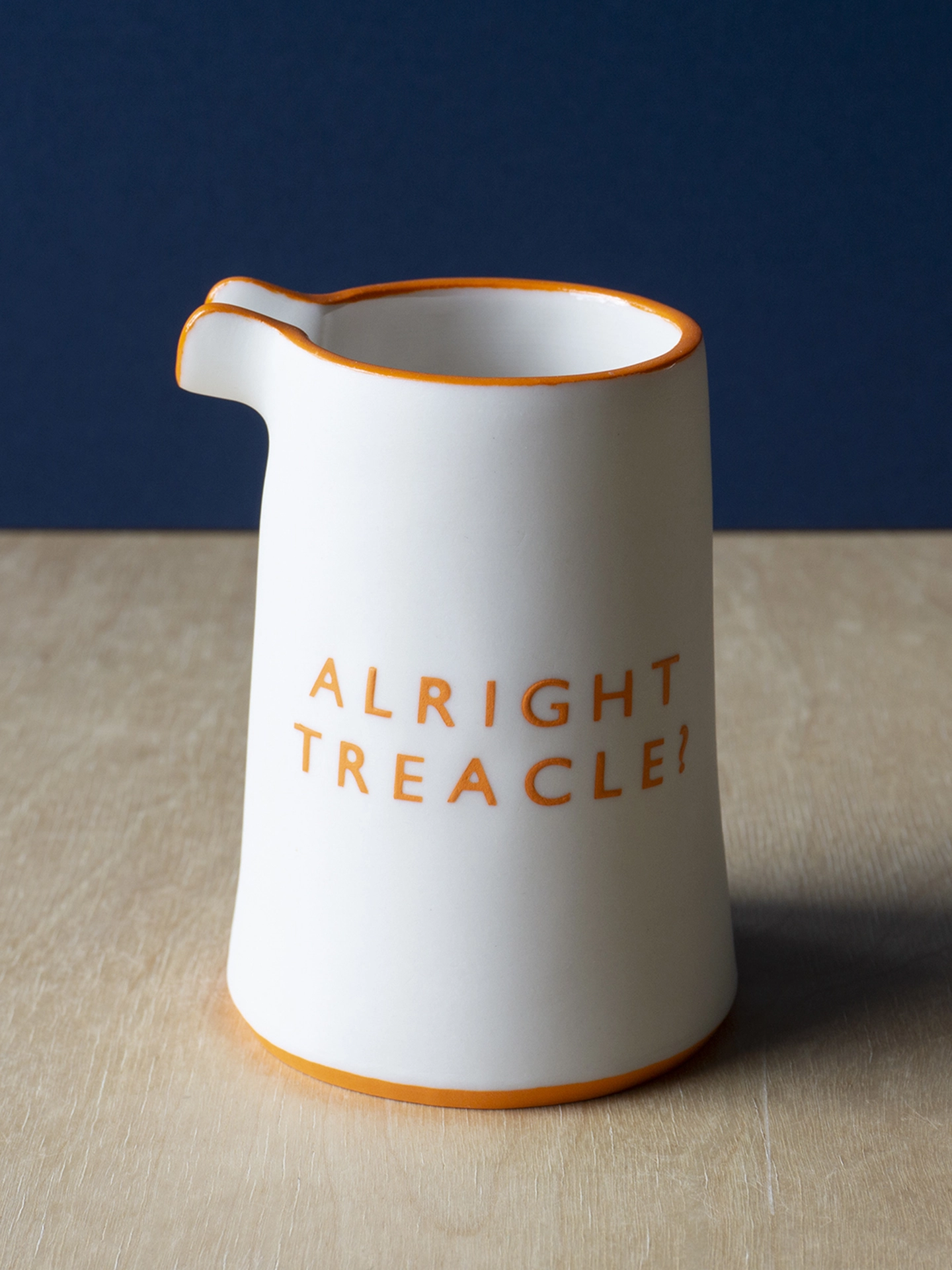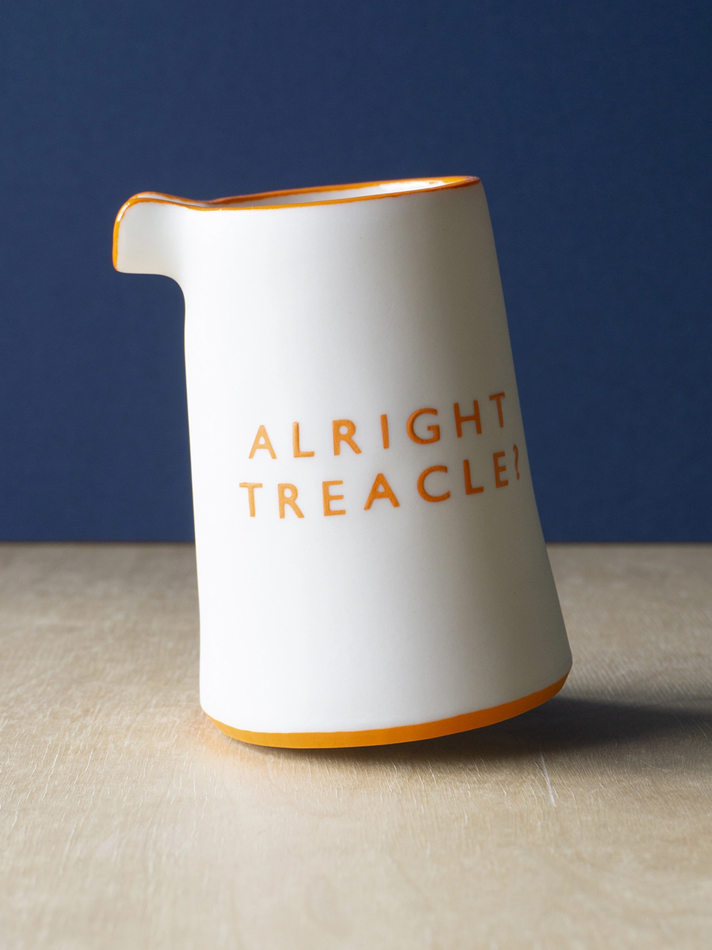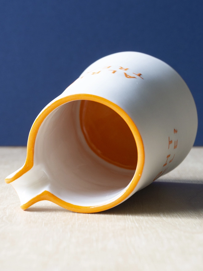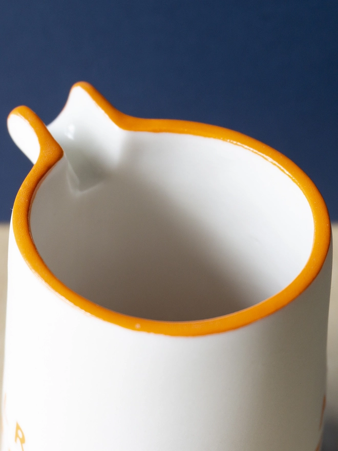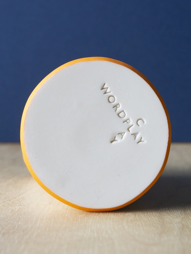 Polished porcelain with orange inlaid lettering, food safe underglaze and gloss glazed rim and interior.