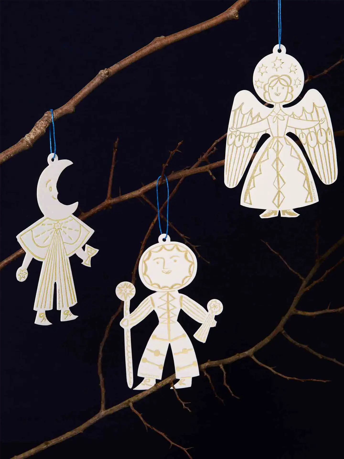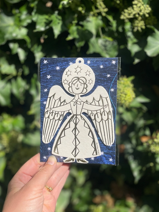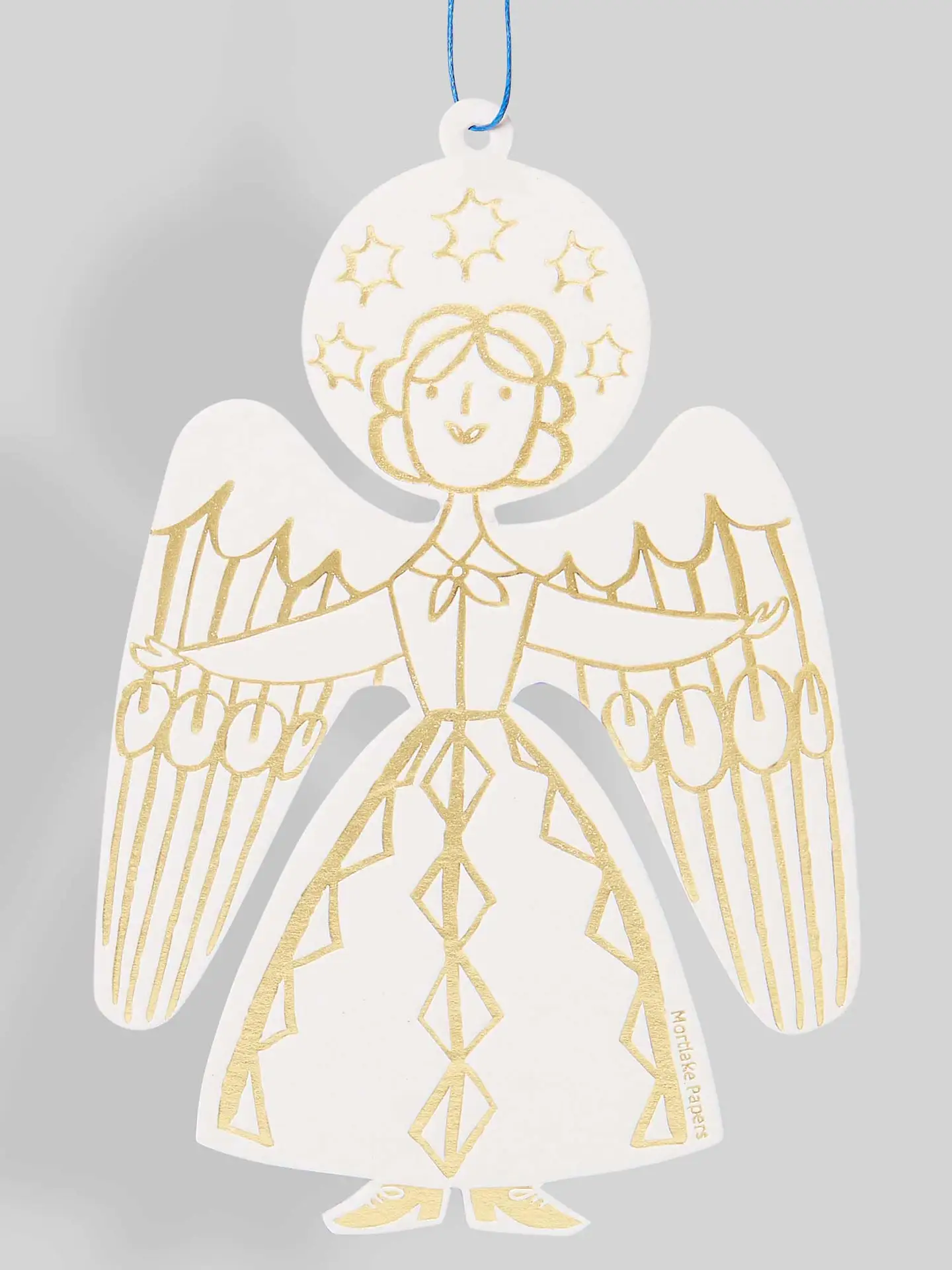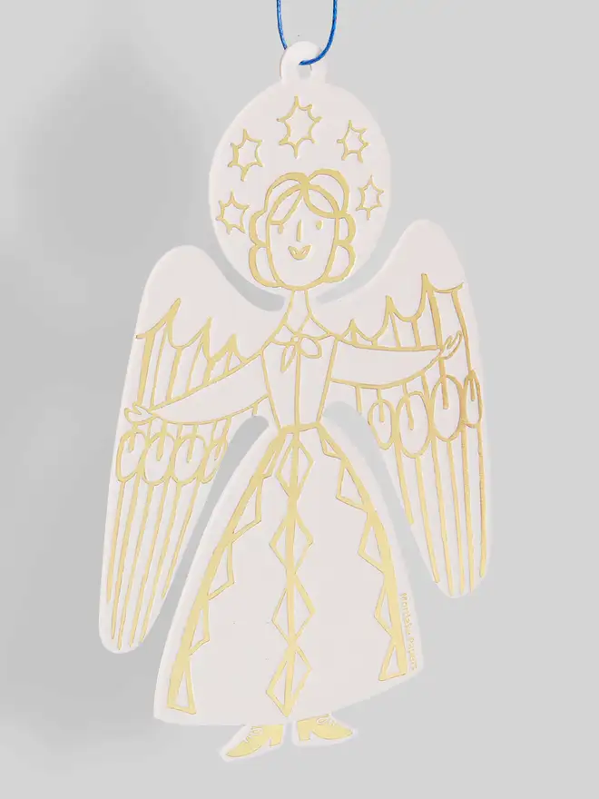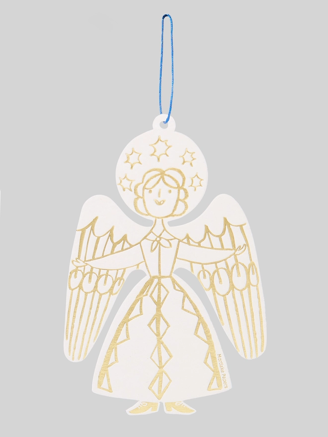 Bring a touch of celestial grace to your home with this letterpress angel decoration, a timeless holiday ornament crafted from paper. The angel’s flowing form is highlighted with delicate gold-foil details that shimmer beautifully in the light, and it comes ready to hang with a soft blue cotton cord. This enchanting keepsake makes a perfect Christmas tree decoration, a thoughtful winter gift, or a flat, easy-to-post present tucked inside a Christmas card.
