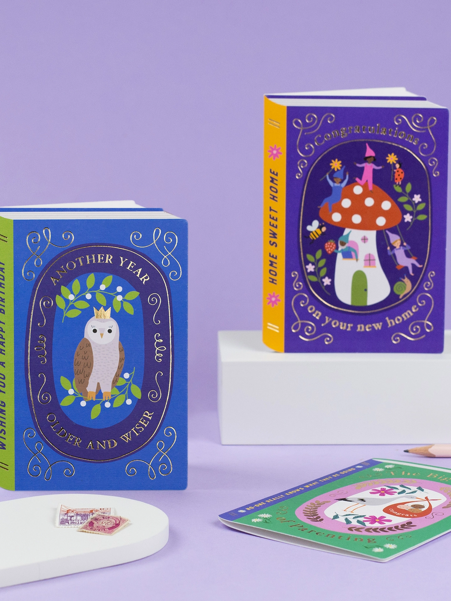 Pull this storybook birthday card off the shelf, read its spine caption of “Wishing you a Happy Birthday” and admire the illustrated owl on the front cover. Celebrating “Another Year Older and Wiser”, the gold foil caption and details add a touch of glitz to the luxury birthday card. Add your own handwritten story to the inside of the die cut birthday card for that personal touch.