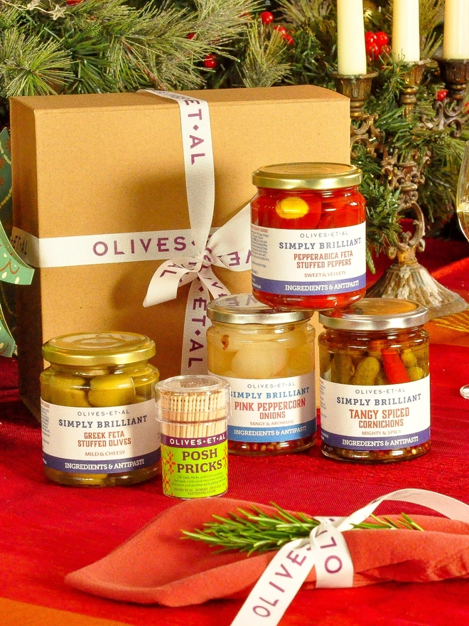 A ready-made antipasti spread featuring feta-stuffed peppers and olives, pink peppercorn onions, spiced cornichons, and posh pricks. Packed with bold Mediterranean flavour.
