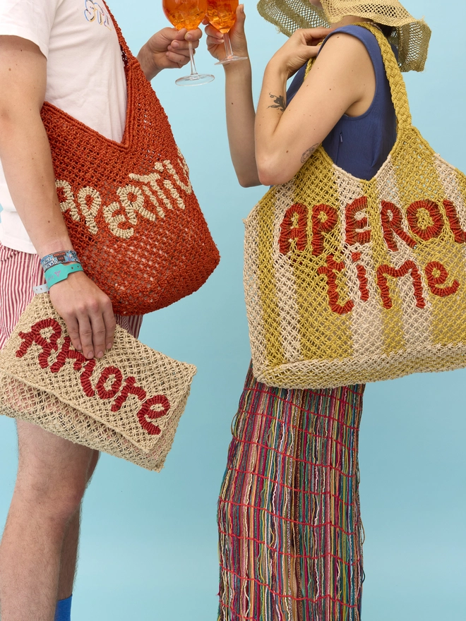 The Jacksons bags are established worldwide as the original jute macrame bags, authentically made by hand. Having spent over 15 years refining and pushing the boundaries of this traditional bag making technique, the brand's unique placement of words and characters are instantly recognisable. Practical and playful, they are designed for everyday use as the perfect shopper, beach bag, travel bag or stylish tote for work or pleasure. Their colourful combinations and positive affirmations are sure to bring joy to your day.