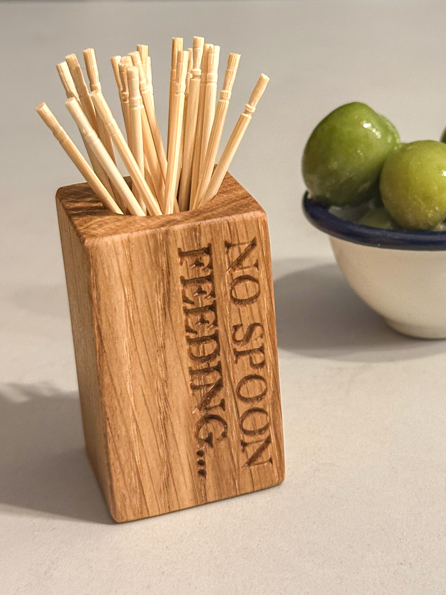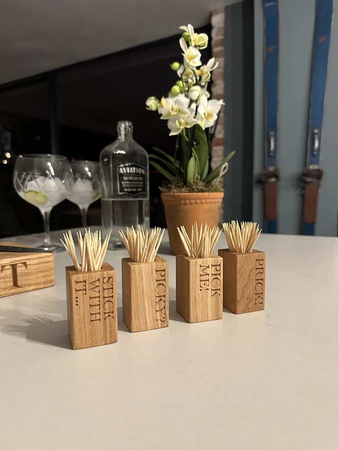 An often overlooked and even forgotten little detail at any gathering. This little solid oak cocktail stick cup won’t go unnoticed! It might even become an icebreaker or talking point!