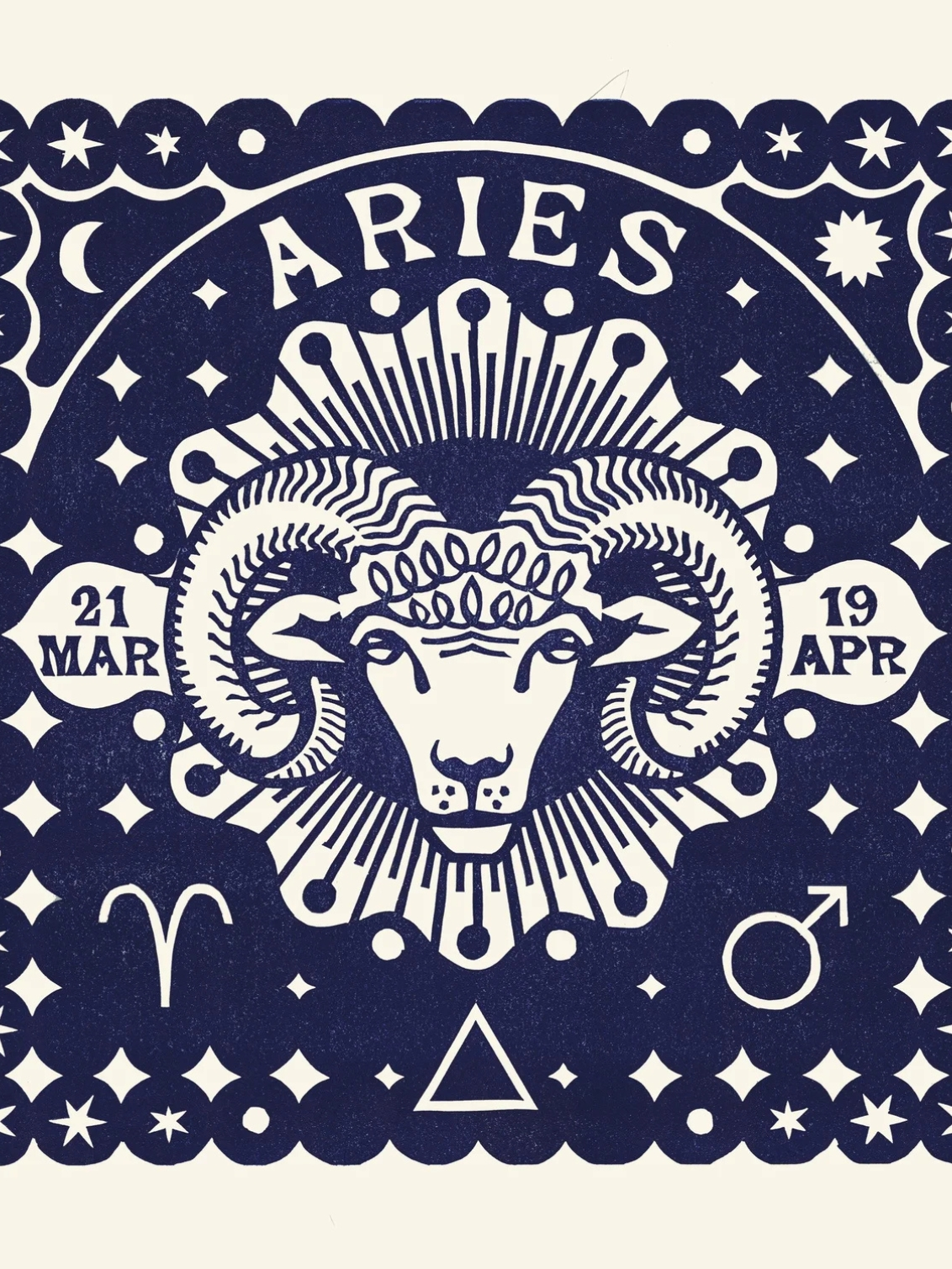 Shown on this print is an approximate date span for Aries of March 20 – April 19. The dates may vary slightly each year due to Earth's orbit and leap years, so those born near the start or end should check their birth chart to confirm their sign.