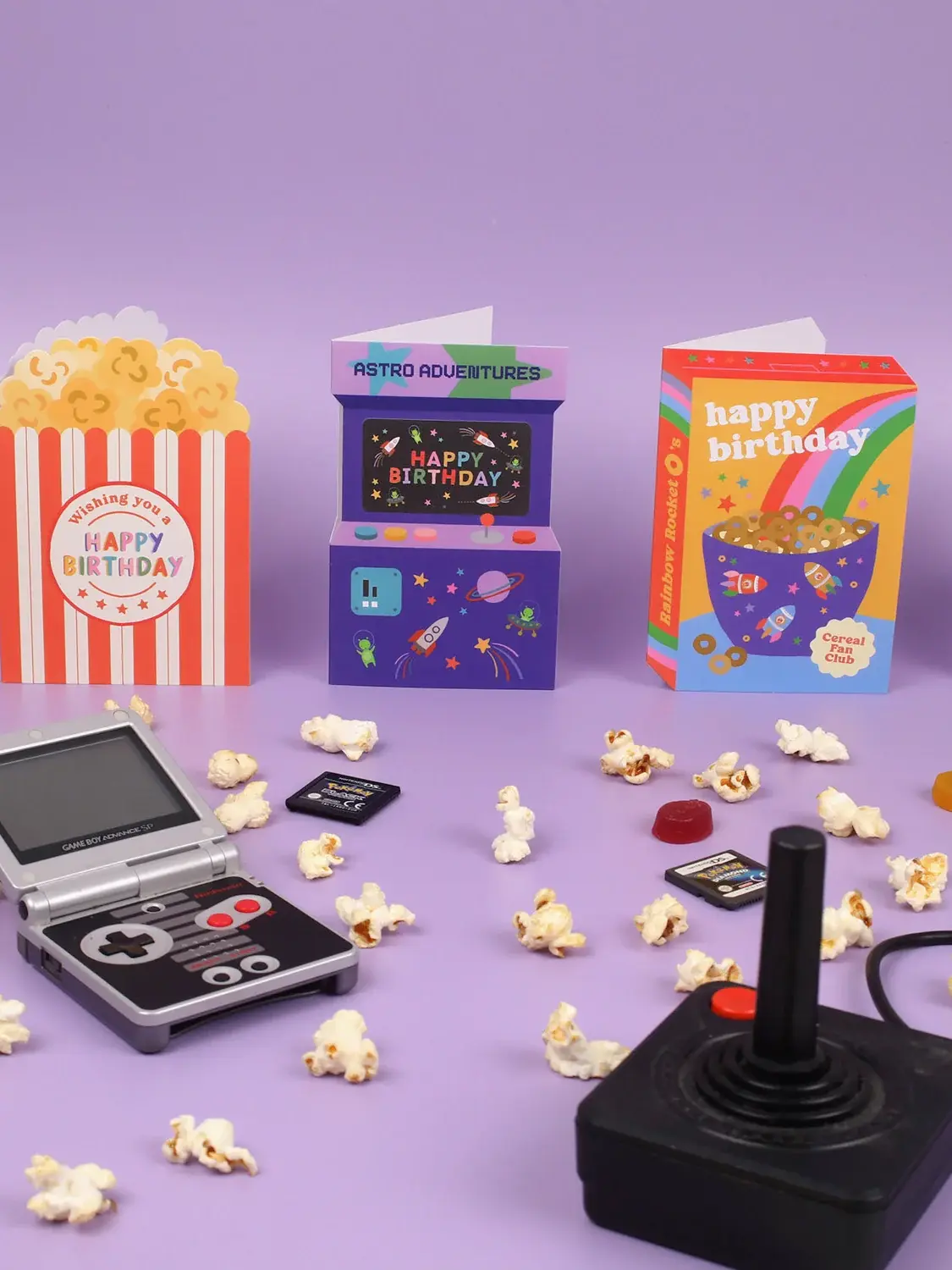 Embark on a journey of fun and nostalgia with our exciting Astro Adventures Arcade Game-Shaped Birthday Card. This unique greeting card, designed to resemble a classic arcade game machine, captures the thrill of space exploration with its vibrant colours and intricate details.