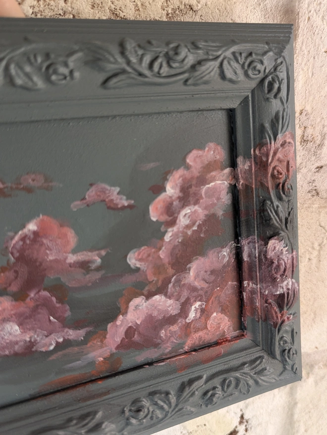 A hand painted vintage frame artwork with an 'Inchyra Blue' by Farrow & Ball background colour featuring Raspberry/Plum and pink coloured clouds...