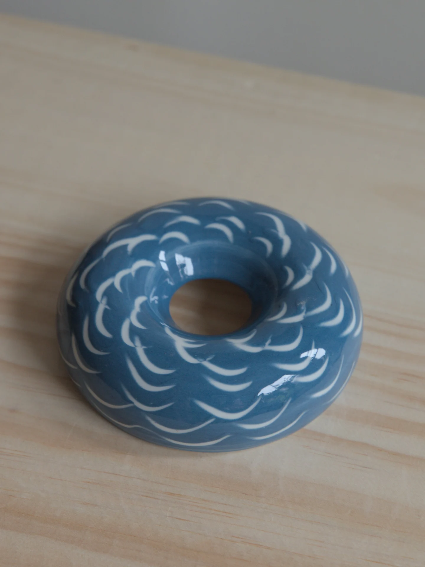 Each piece is hand made, featuring a one-of-a-kind pattern crafted with blue porcelain slip and finished with a glossy, transparent glaze...