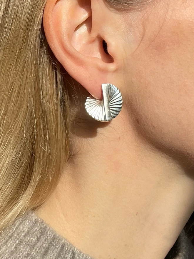 The Baby Fan Earrings are cast from solid sterling silver with a layered, spiral design that gently curves on the reverse to fit comfortably behind the ear...