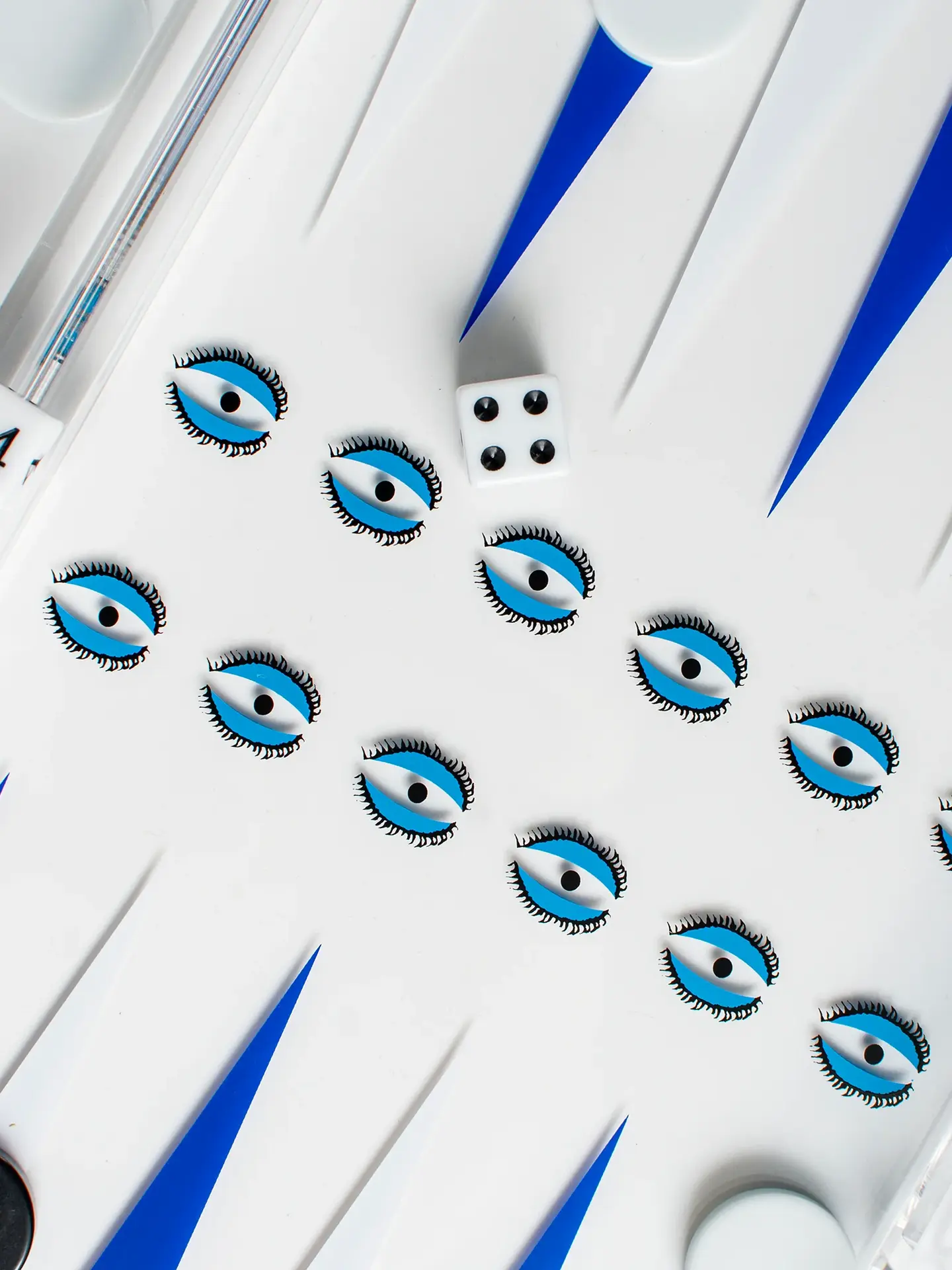 Our transparent Eye Backgammon Set is the perfect combination of function and unique design. The set is adorned with our signature eye print and has a transparent finish. After playing, fold it closed for a chic addition on your coffee table.This set makes a fabulous gift.