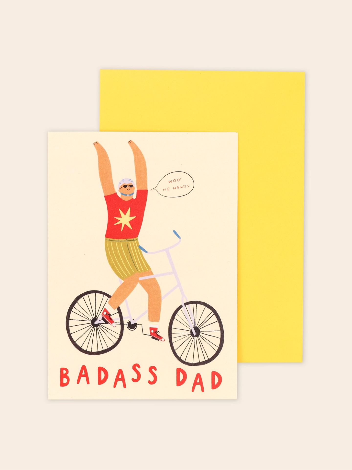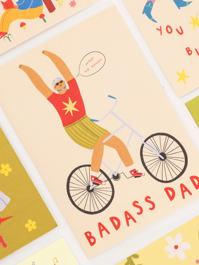 Contemporary birthday card featuring a cheeky dad riding a bike with no hands, perfect for bicycle loving dads for Father's Day and Birthdays.