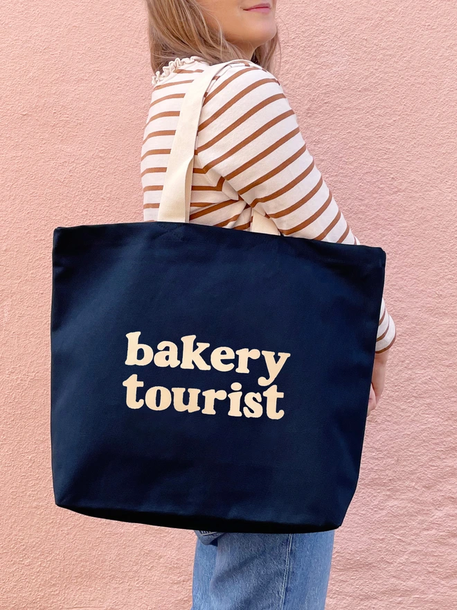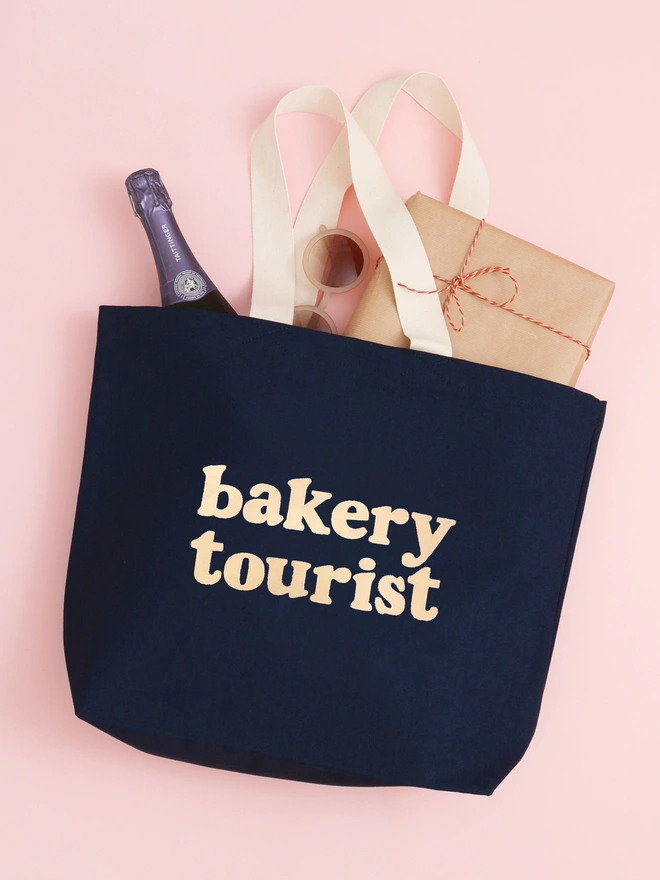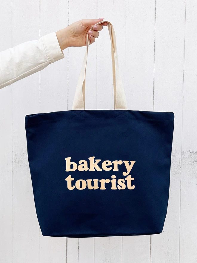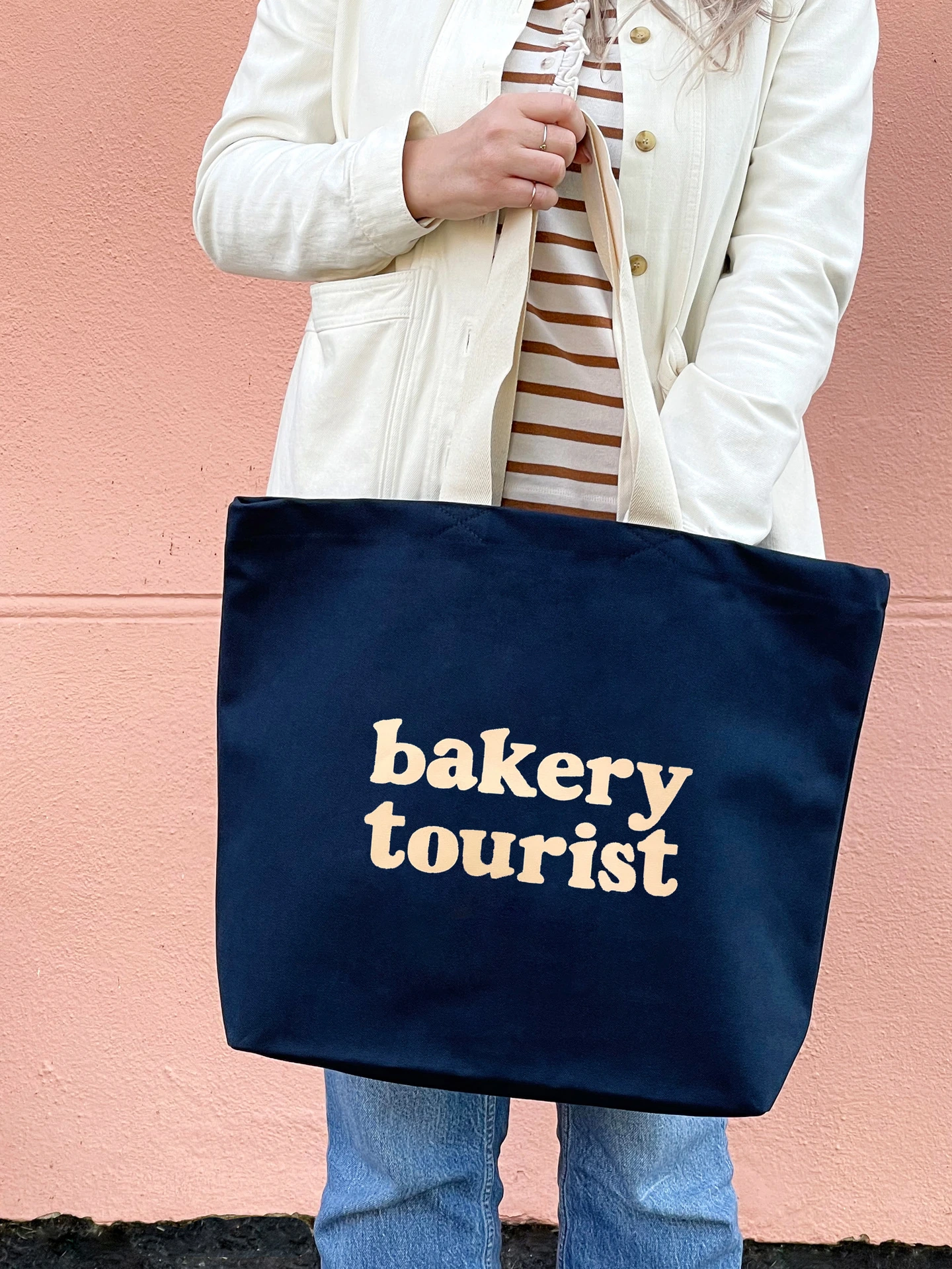 Our ‘Bakery Tourist’ design has been printed in peach on rust canvas or cream on dark navy blue canvas. Handmade with love in the UK. A cute gift for bakers, foodies, and anyone who loves discovering new bakeries.