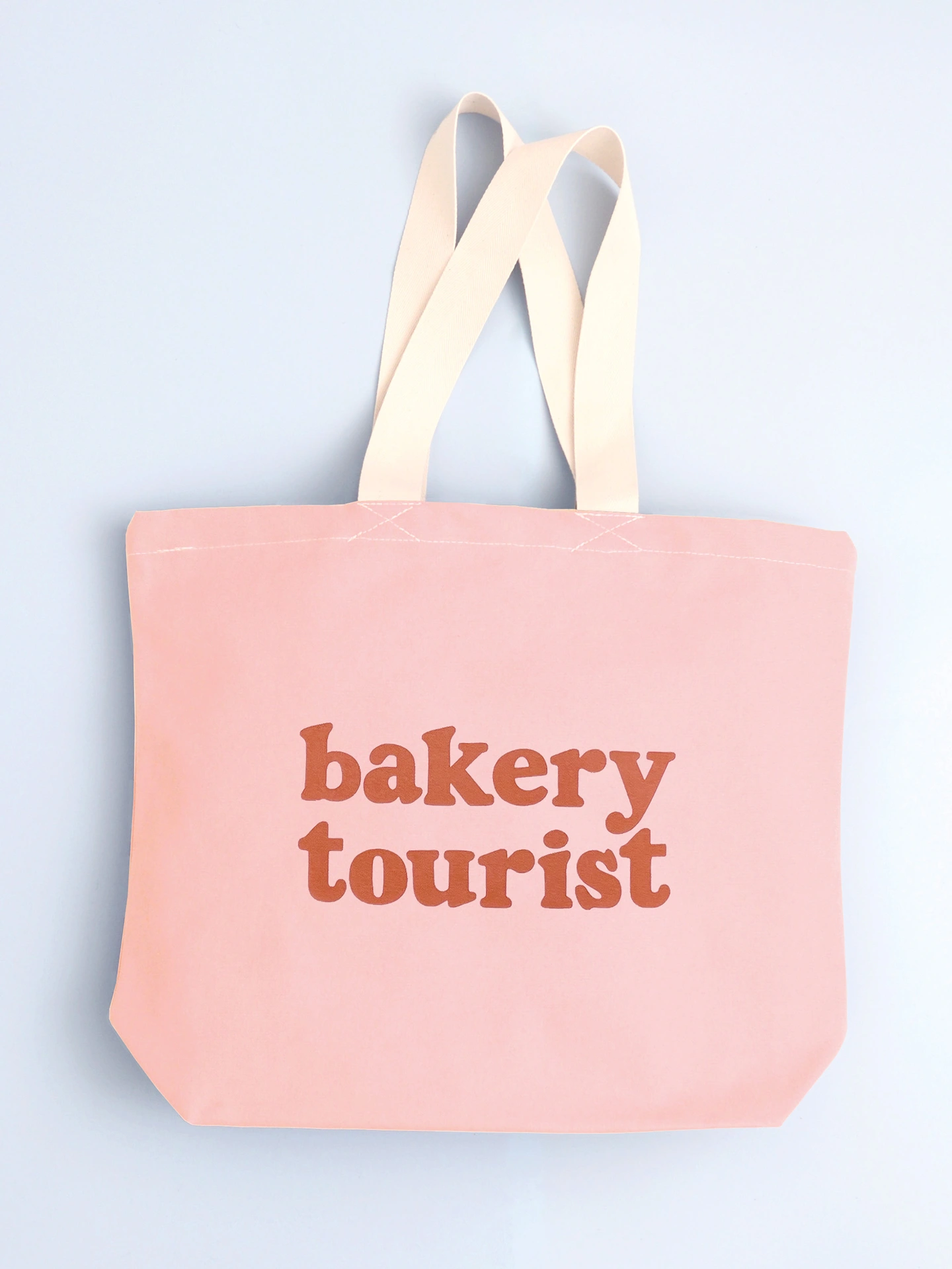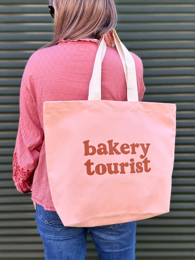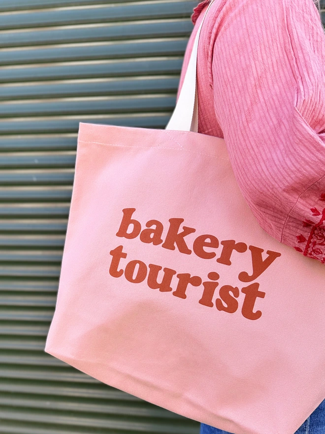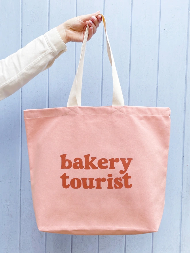 Our ‘Bakery Tourist’ design has been printed in peach on rust canvas, tan on blush pink canvas or cream on dark navy blue canvas. Handmade with love in the UK. A cute gift for bakers, foodies, and anyone who loves discovering new bakeries.