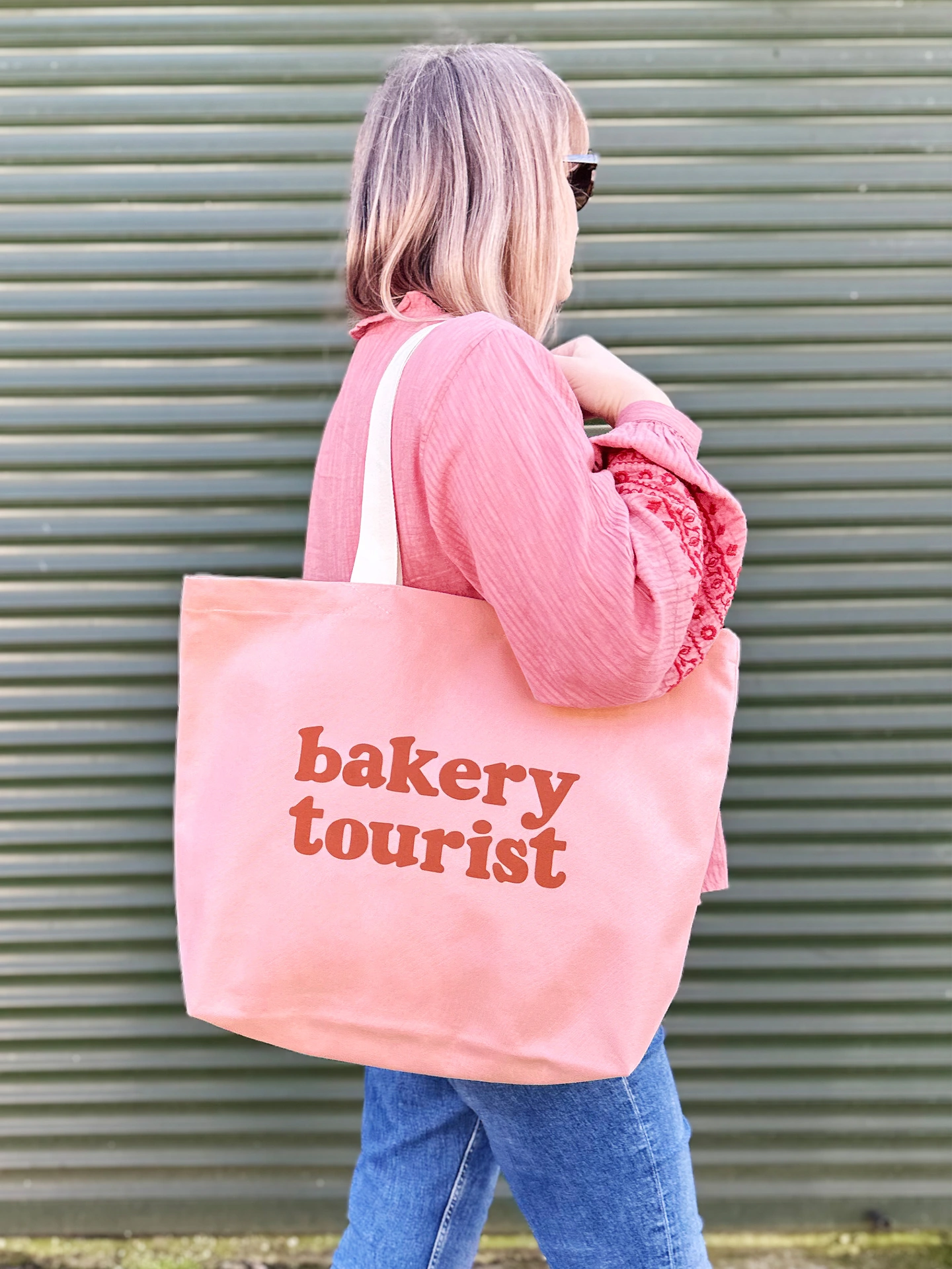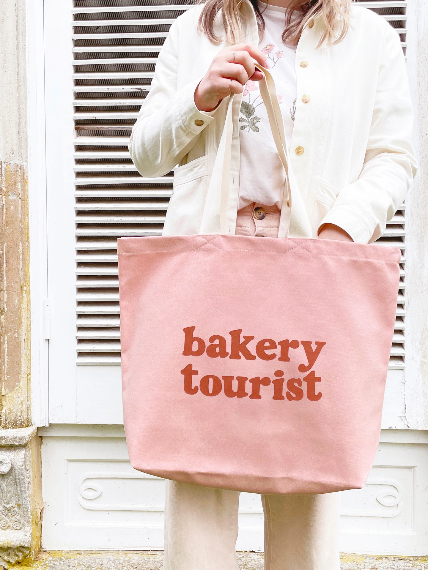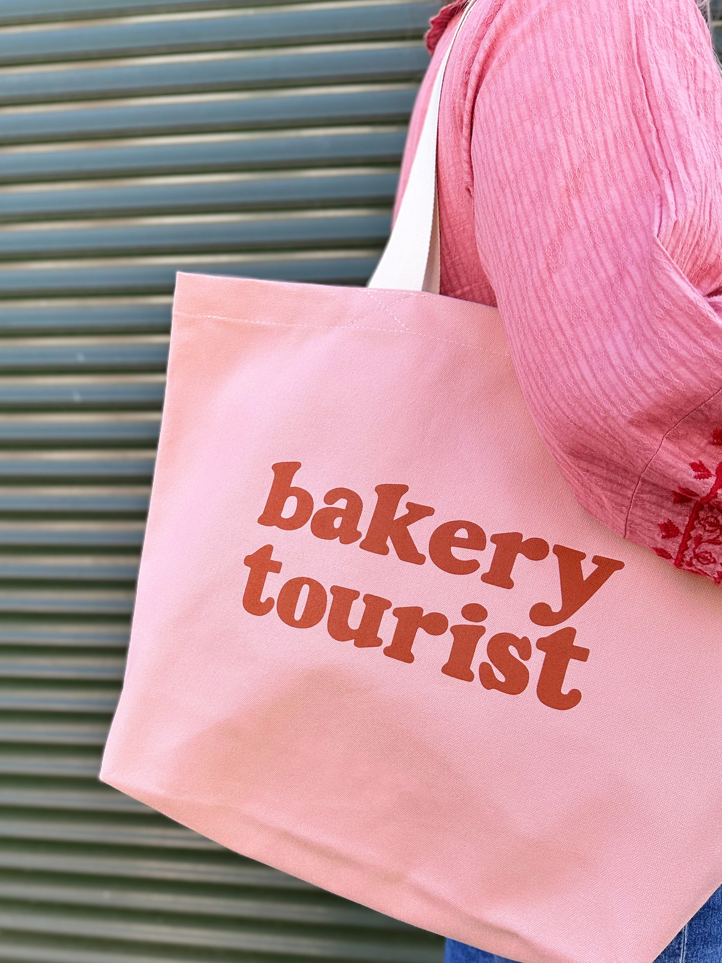 Our ‘Bakery Tourist’ design has been printed in peach on rust canvas, tan on blush pink canvas or cream on dark navy blue canvas. Handmade with love in the UK. A cute gift for bakers, foodies, and anyone who loves discovering new bakeries.