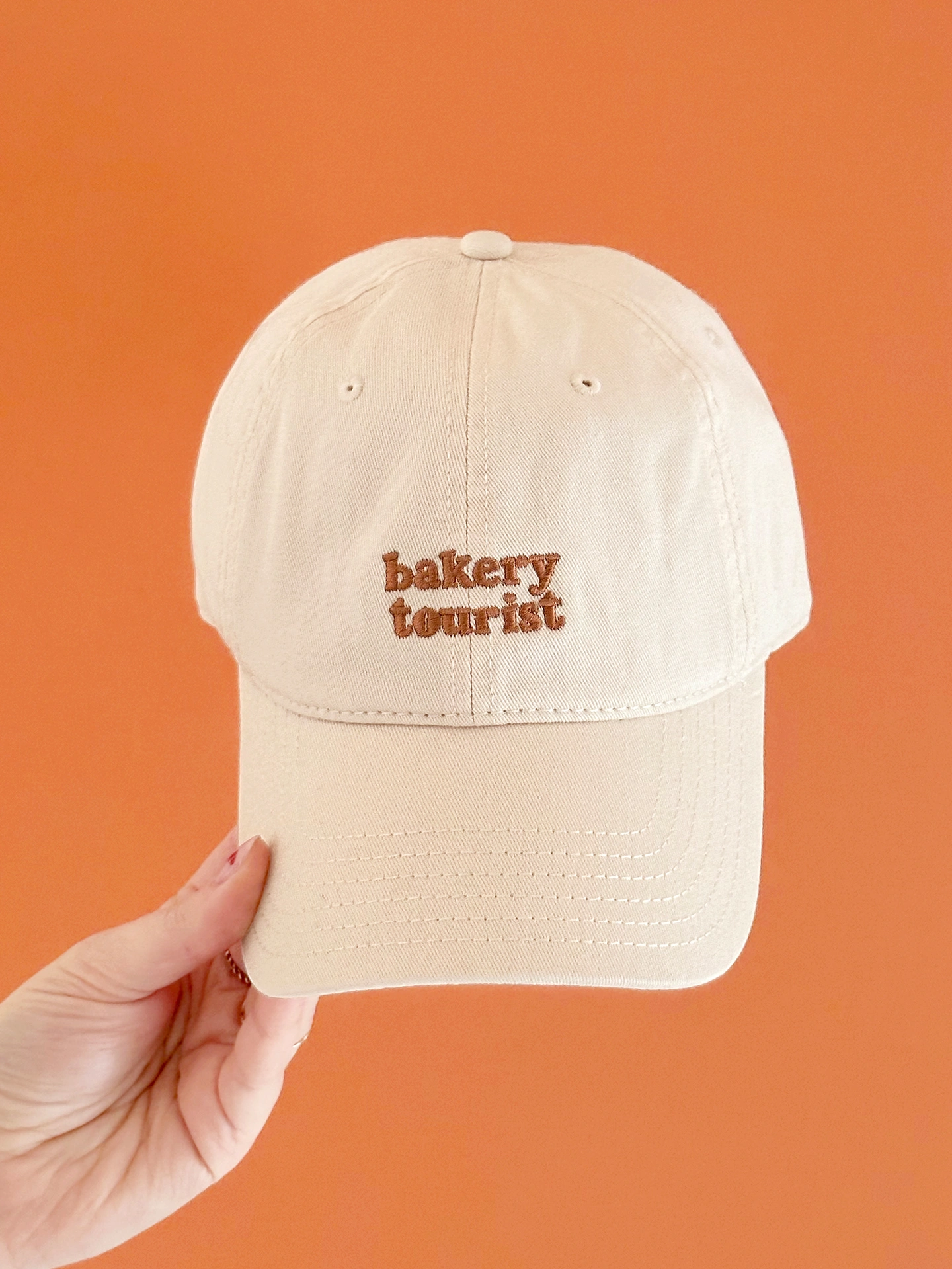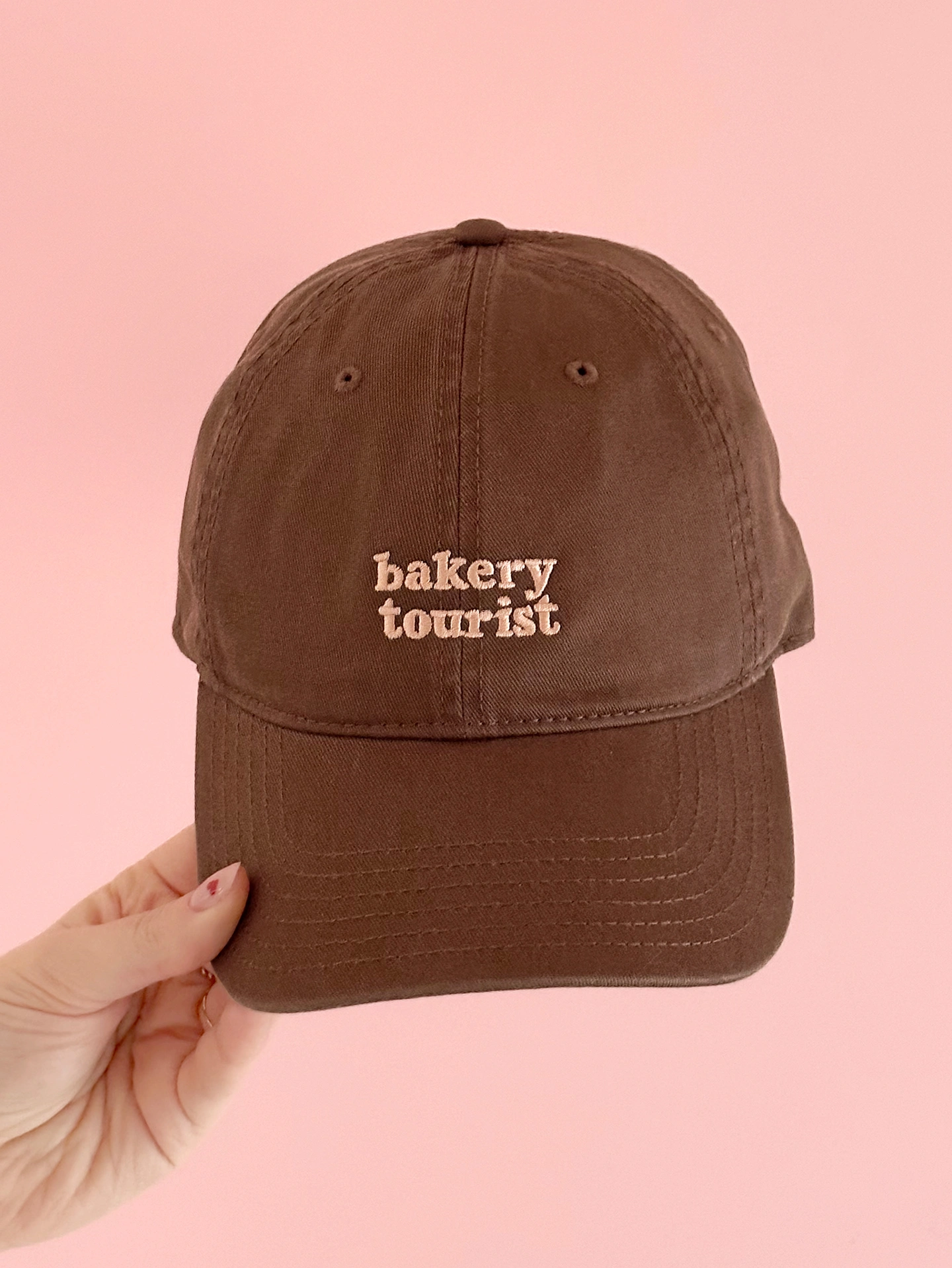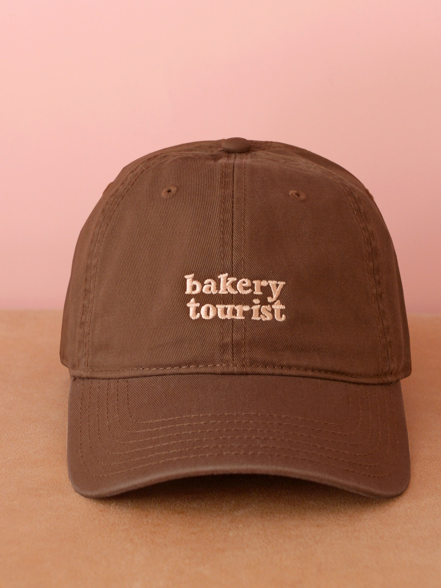 Our 'Bakery Tourist' design is embroidered in pale pink on a cocoa brown cotton cap and tan on an off-white cotton cap. A cute and practical gift for bakers, foodies, and anyone who loves discovering new bakeries.