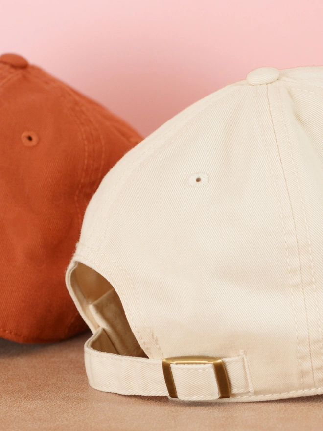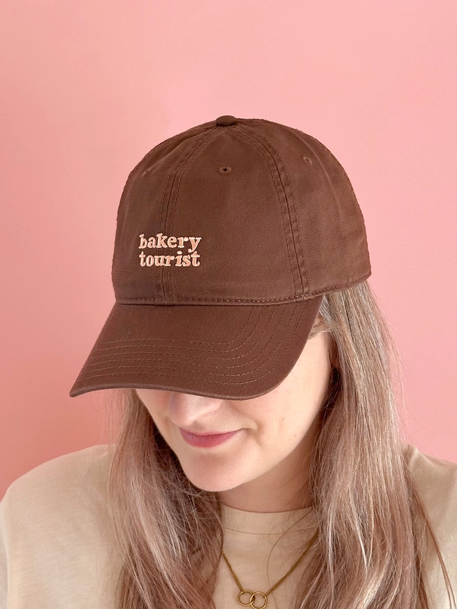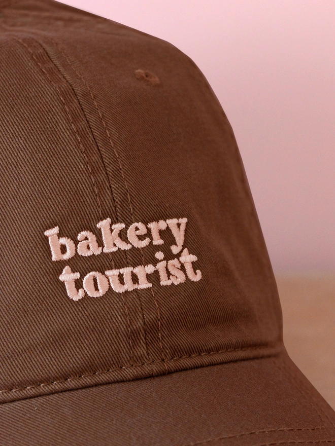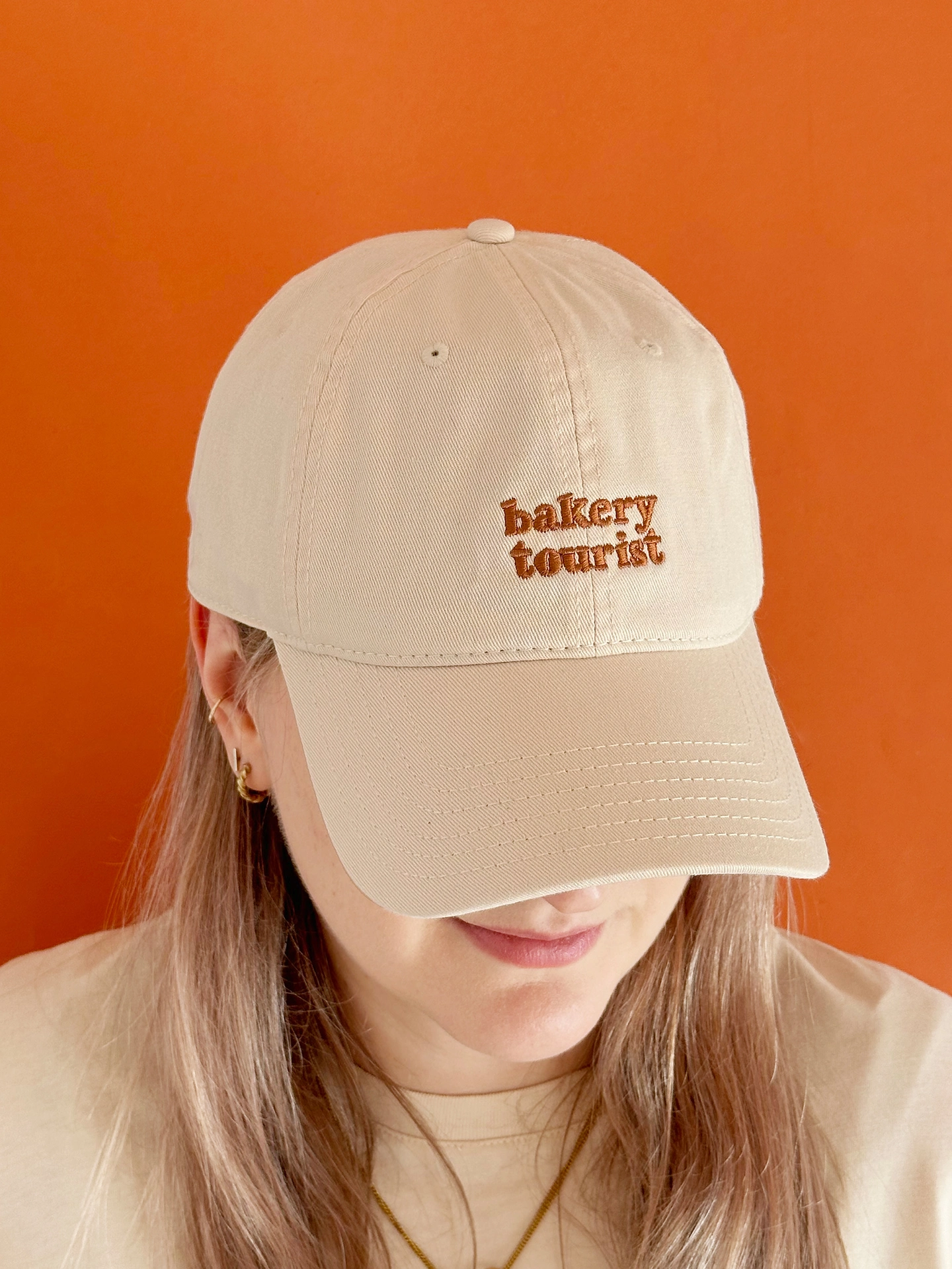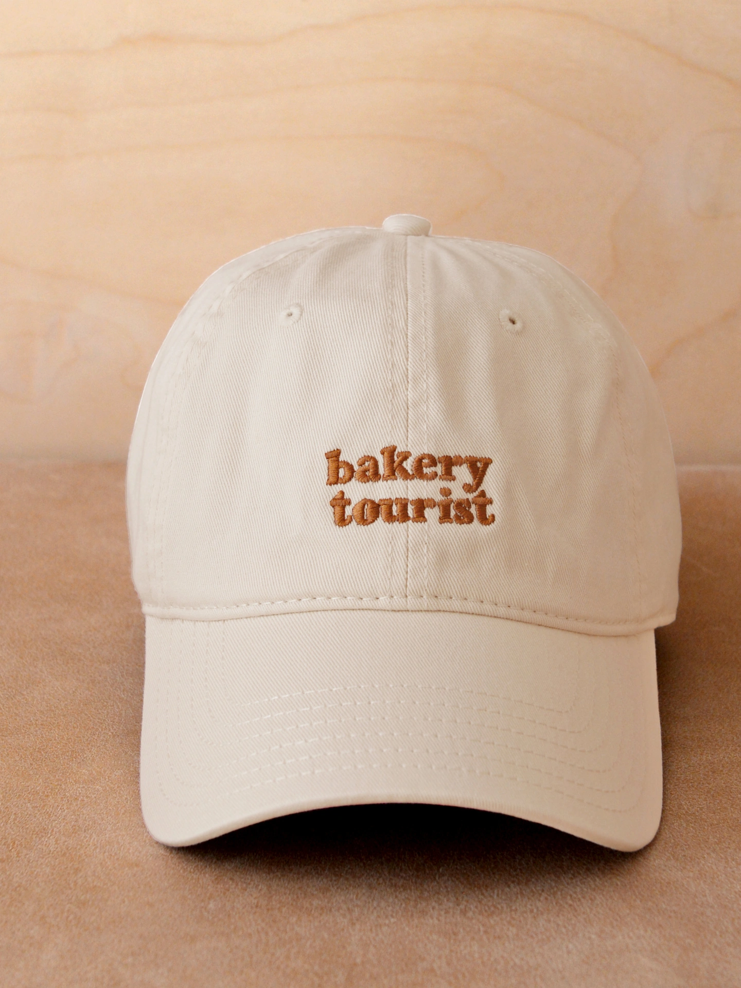 Our 'Bakery Tourist' design is embroidered in pale pink on a cocoa brown cotton cap and tan on an off-white cotton cap. A cute and practical gift for bakers, foodies, and anyone who loves discovering new bakeries.