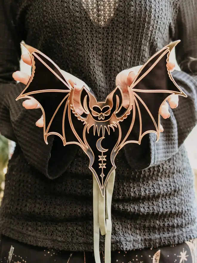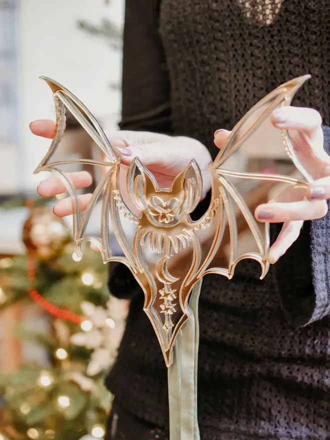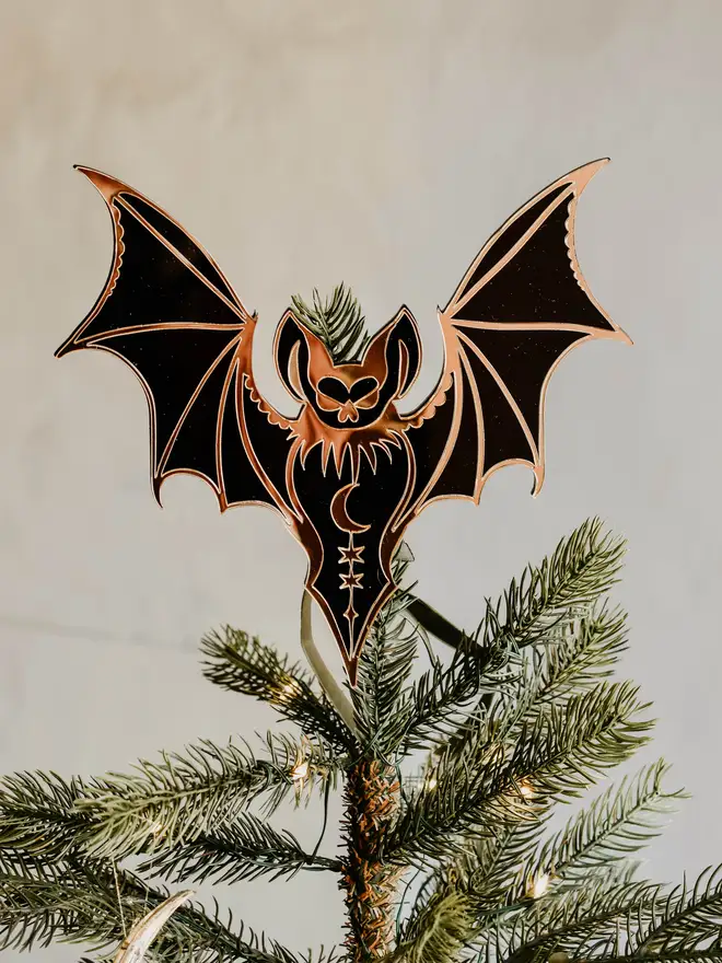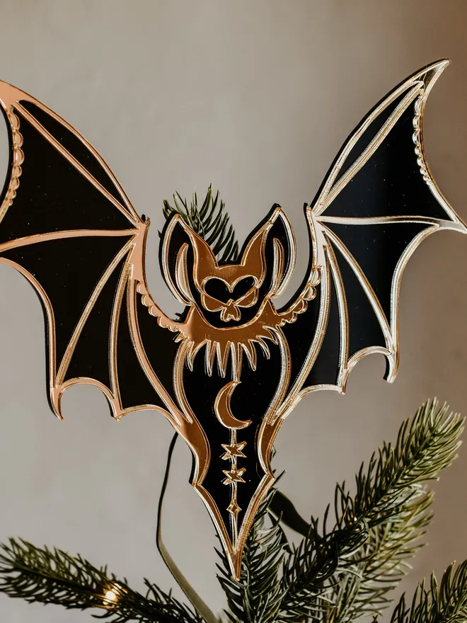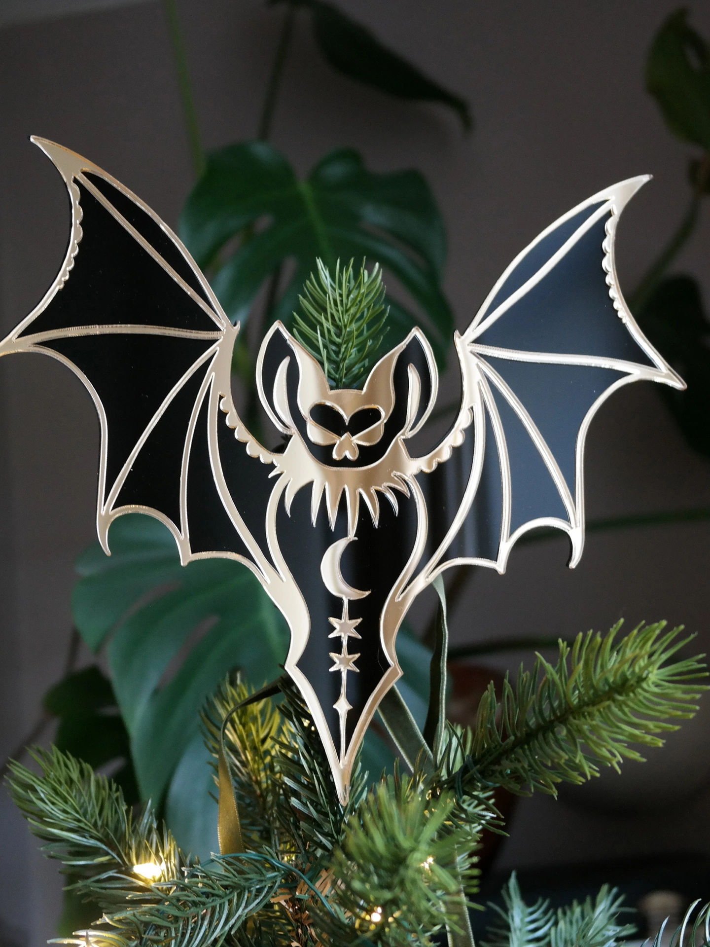 Dare to be different with the shiniest bat moon tree topper made from silver and gold mirror acrylic.