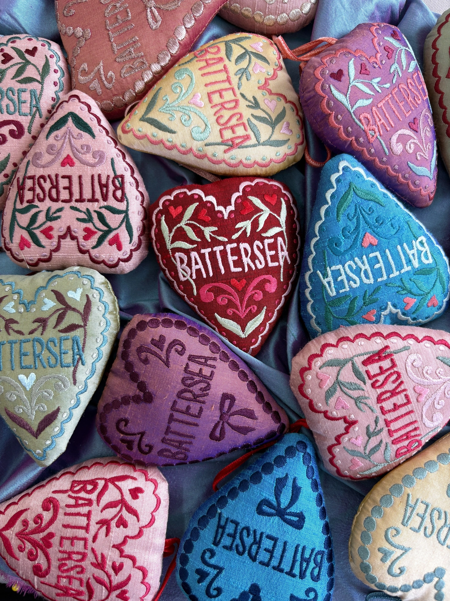Freehand embroidered dupion silk heart ornaments! 1-of-1 samples and colour experiments