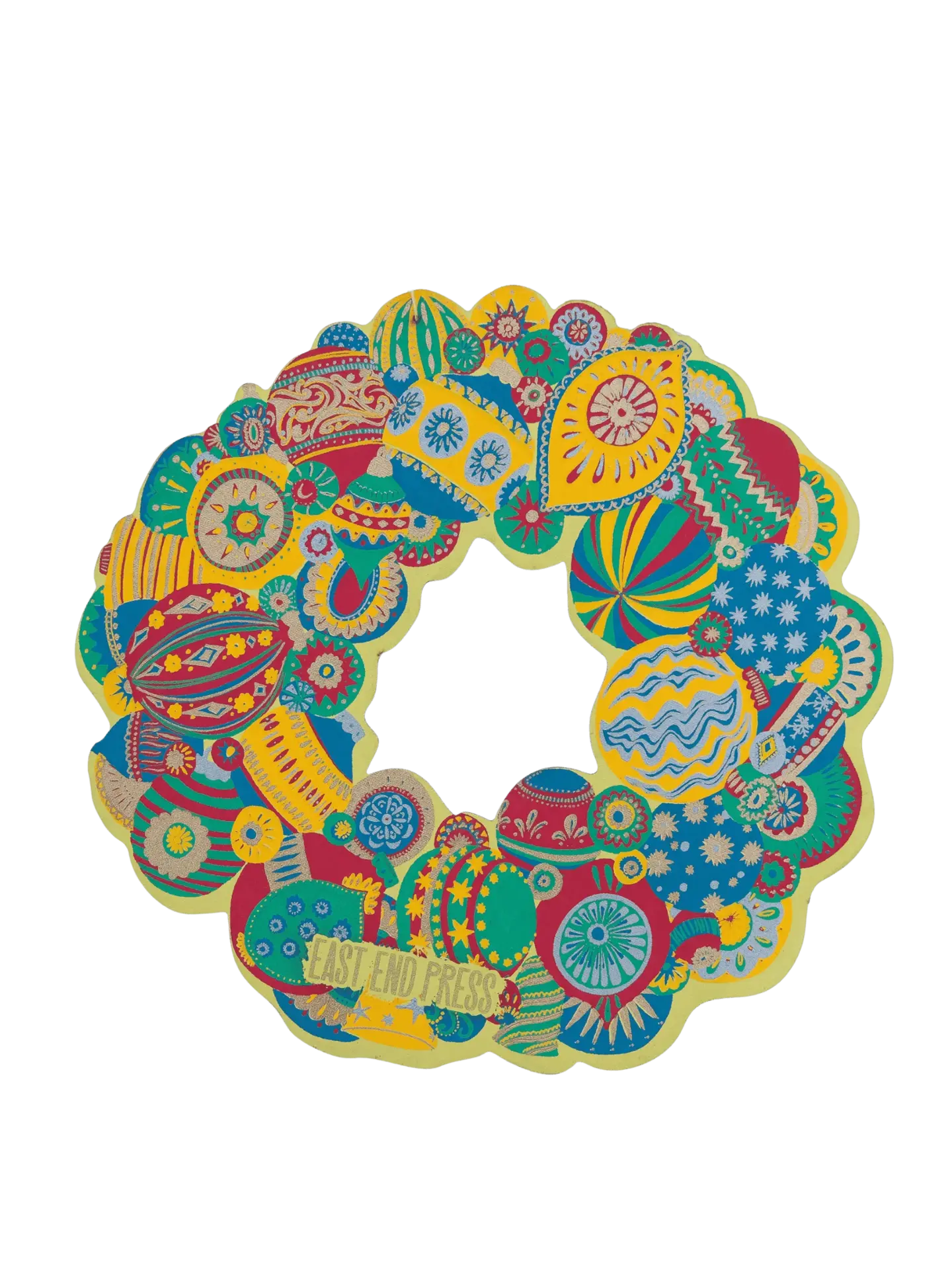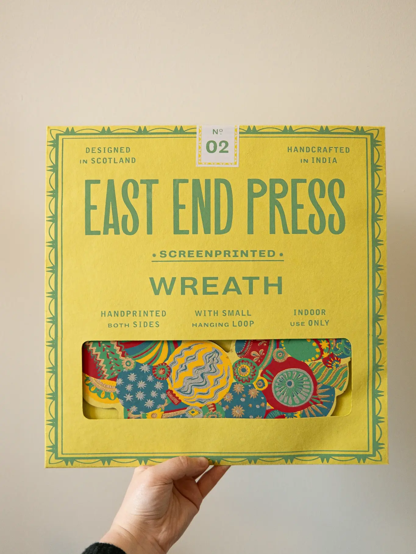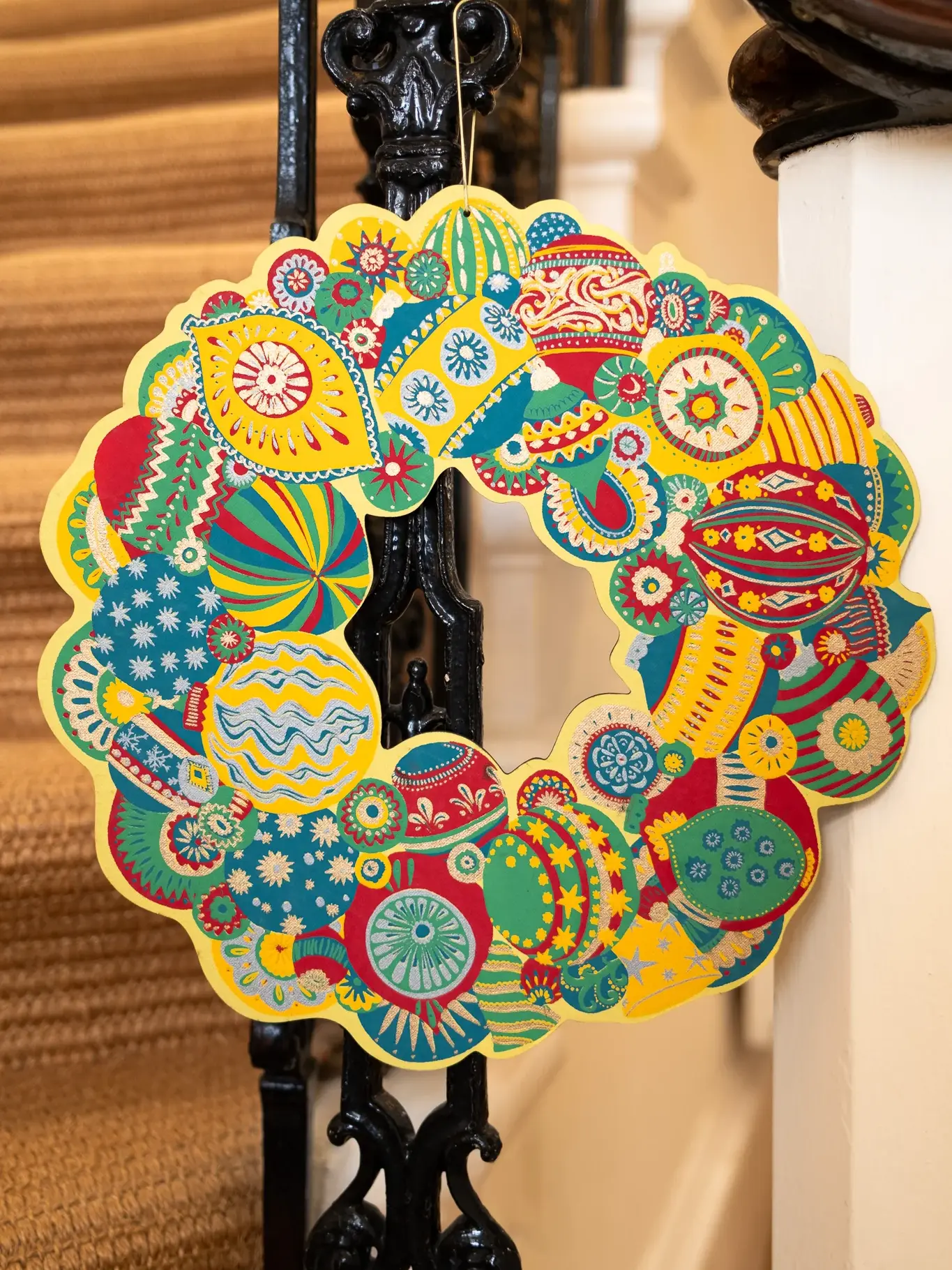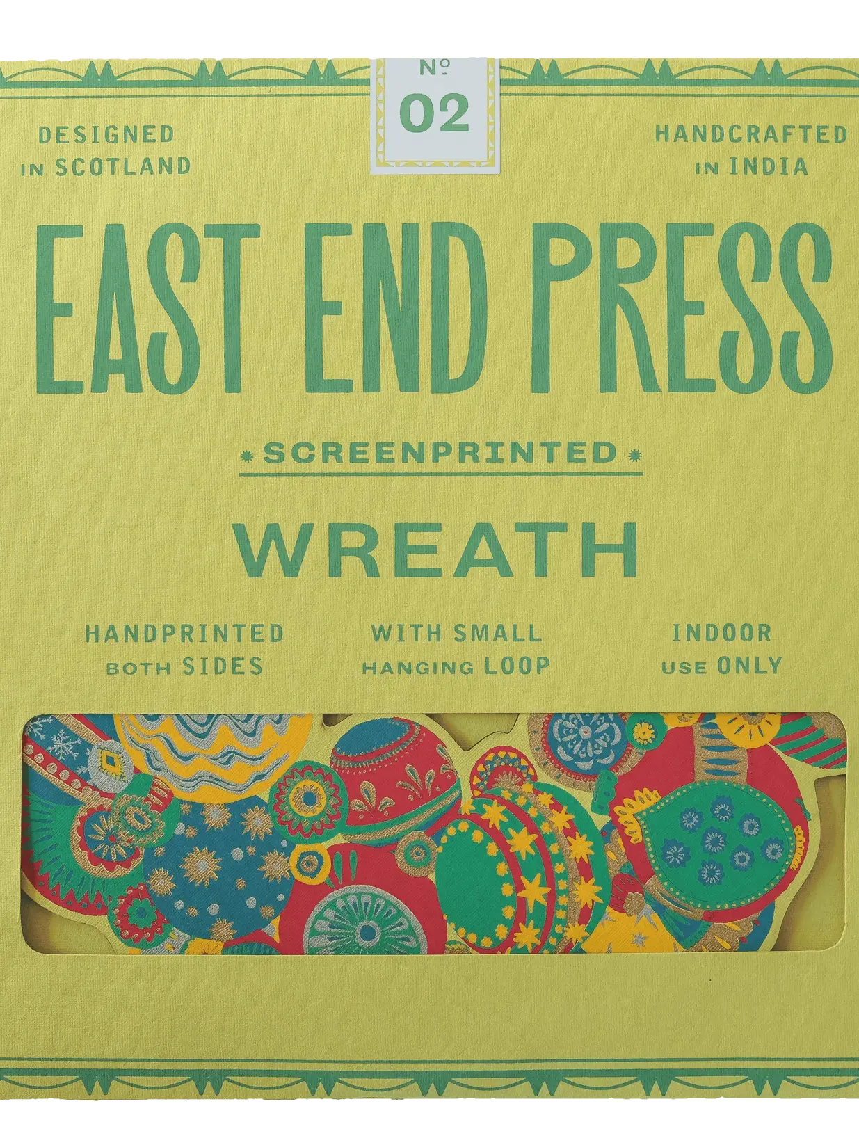 Our decorative wreaths are screen printed on both sides on sustainably cotton paper board. Every decoration is made by hand and each come with a small hanging loop ready to be hung from doors, walls and indoor surfaces as beautiful Christmas ornaments for your home.