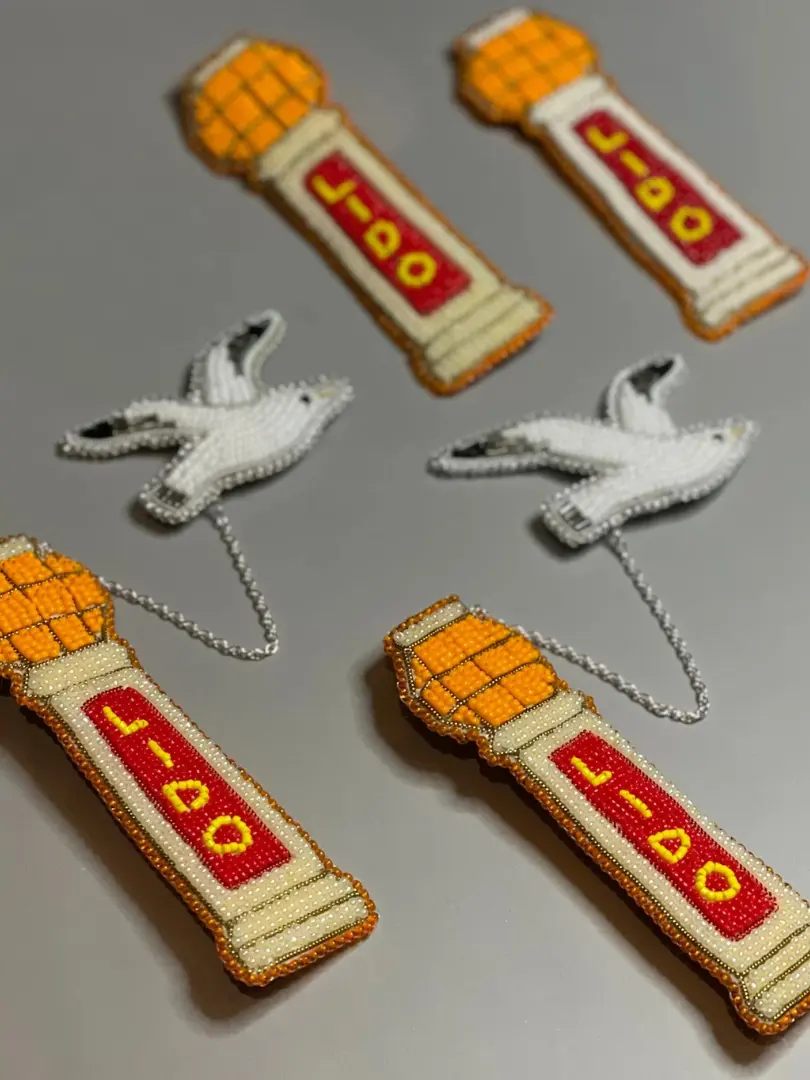 Handmade beaded brooch in the image of the iconic Margate Lido sign, with seagull brooch attached by thin chain