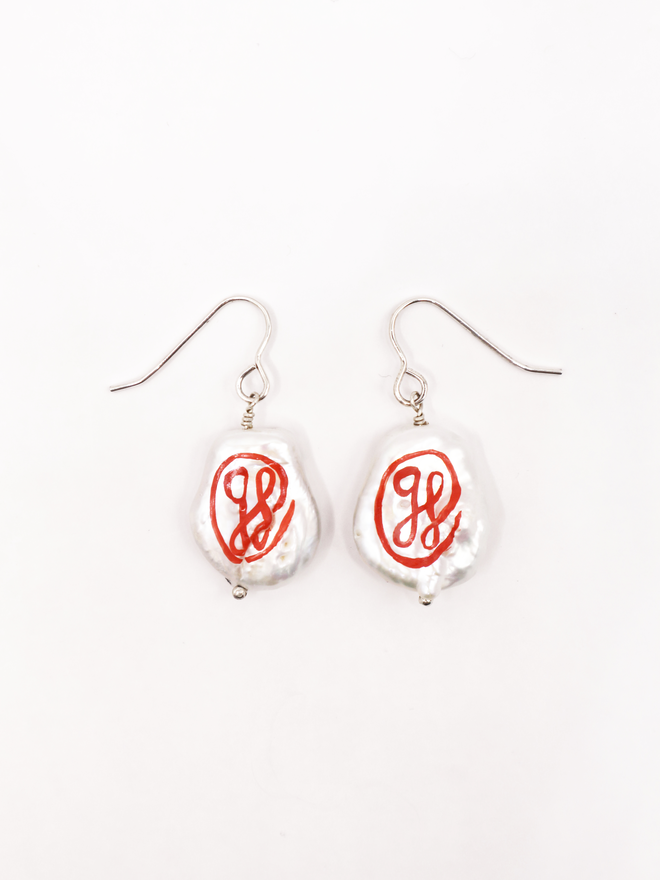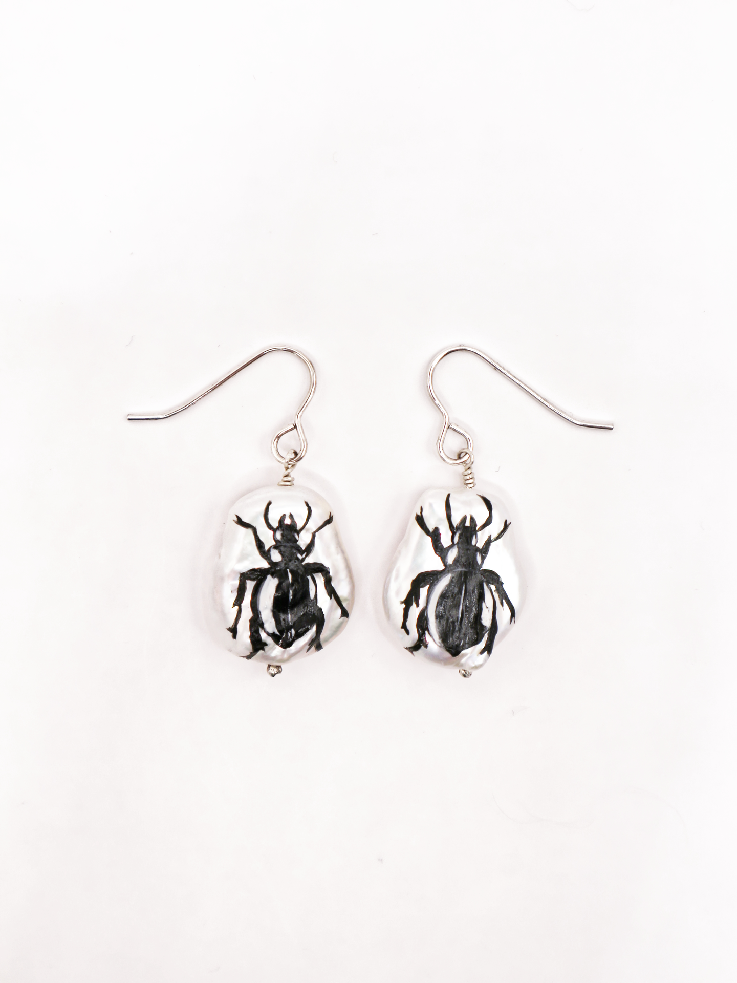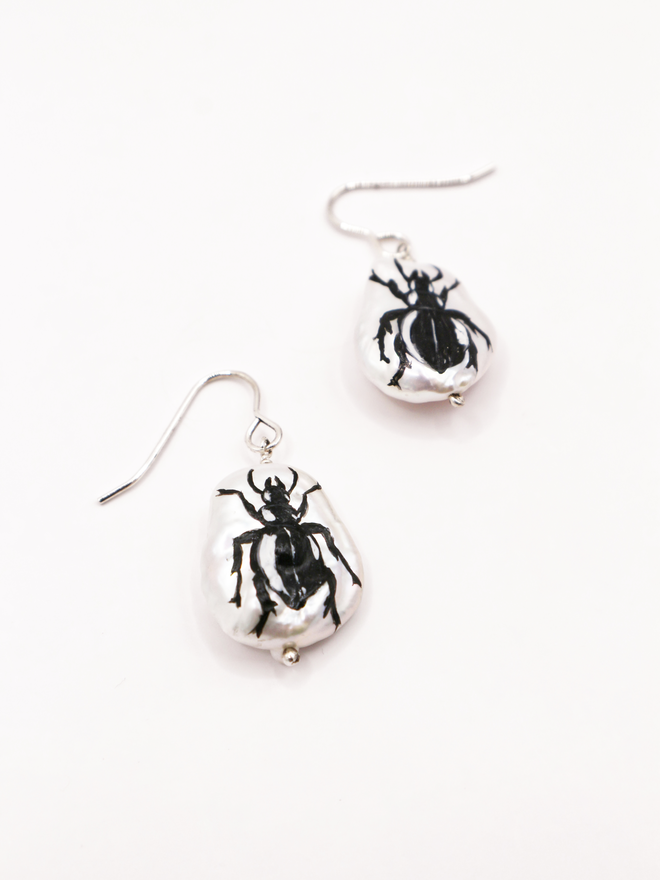 A pair of petal shaped pearls set in sterling silver and finished with a hand painted beetle motif.