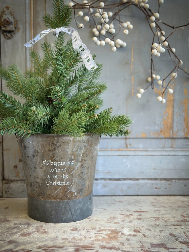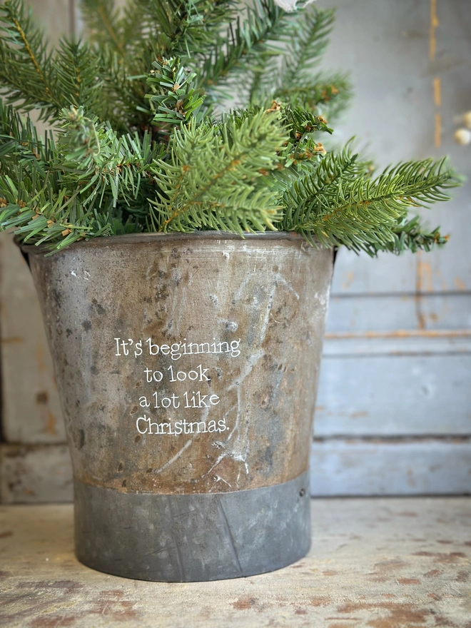 Each recycled metal holder is selected for its original qualities and as such, bare the signs of time and use. We scout the countryside and beyond to find these wonderful vessels but please be aware, they are recycled and will show rust and patina.these buckets are not water tight so we advise using a liner should you wish to water your tree.