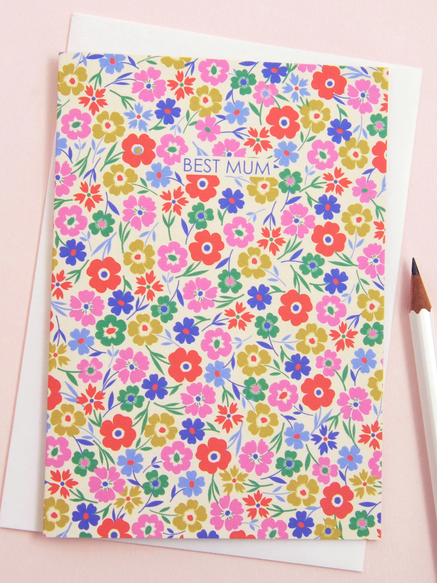 A pretty “Best Mum” card featuring an all-over ditsy floral pattern in pink, red, blue, green and mustard yellow, set against a soft background. The delicate scattered flowers give this design a gentle, joyful feel, while the simple “Best Mum” message kee...